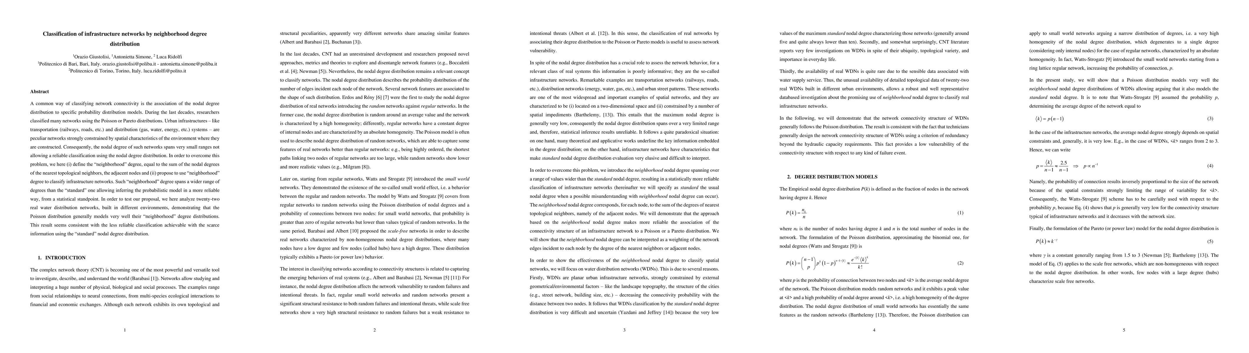 A common way of classifying network connectivity is the association of the nodal degree distribution to specific probability distribution models. During the last decades, researchers classified many networks using the Poisson or Pareto distributions. Urban infrastructures, like transportation (railways, roads, etc.) and distribution (gas, water, energy, etc.) systems, are peculiar networks strongly constrained by spatial characteristics of the environment where they are constructed. Consequently, the nodal degree of such networks spans very small ranges not allowing a reliable classification using the nodal degree distribution. In order to overcome this problem, we here (i) define the neighborhood degree, equal to the sum of the nodal degrees of the nearest topological neighbors, the adjacent nodes and (ii) propose to use neighborhood degree to classify infrastructure networks. Such neighborhood degree spans a wider range of degrees than the standard one allowing inferring the probabilistic model in a more reliable way, from a statistical standpoint. In order to test our proposal, we here analyze twenty-two real water distribution networks, built in different environments, demonstrating that the Poisson distribution generally models very well their neighborhood degree distributions. This result seems consistent with the less reliable classification achievable with the scarce information using the standard nodal degree distribution.