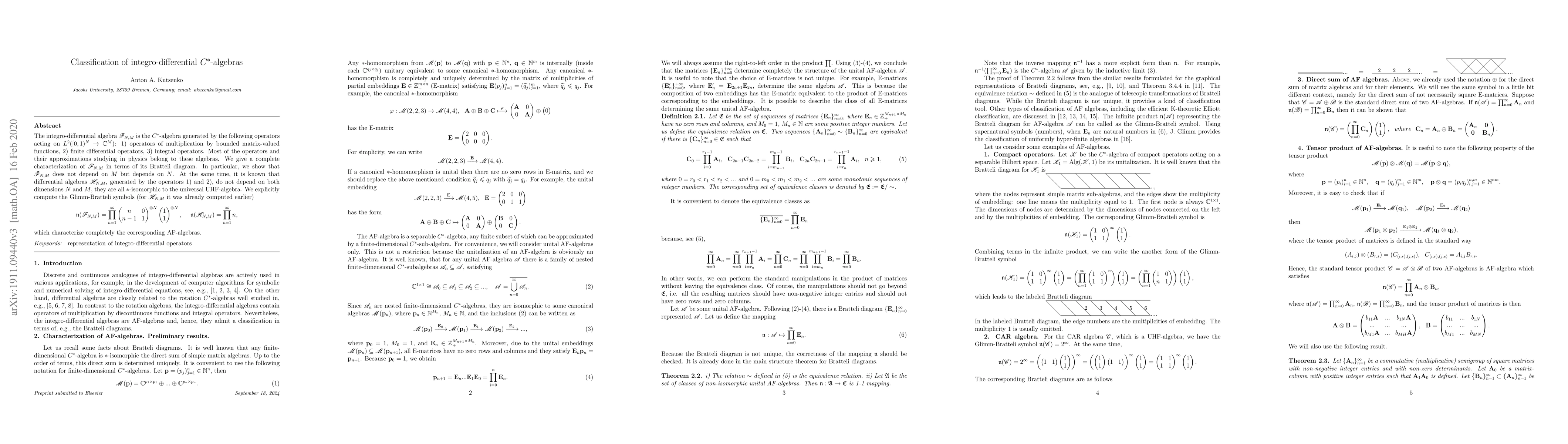 This paper classifies the integro-differential $C^*$-algebra $\mathscr{F}_{N,M}$ generated by multiplication, finite differential, and integral operators. It shows that $\mathscr{F}_{N,M}$ depends only on $N$ and not on $M$, contrasting with $\mathscr{H}_{N,M}$ which is independent of both $N$ and $M$. The study computes the Glimm-Bratteli symbols for both algebras.
