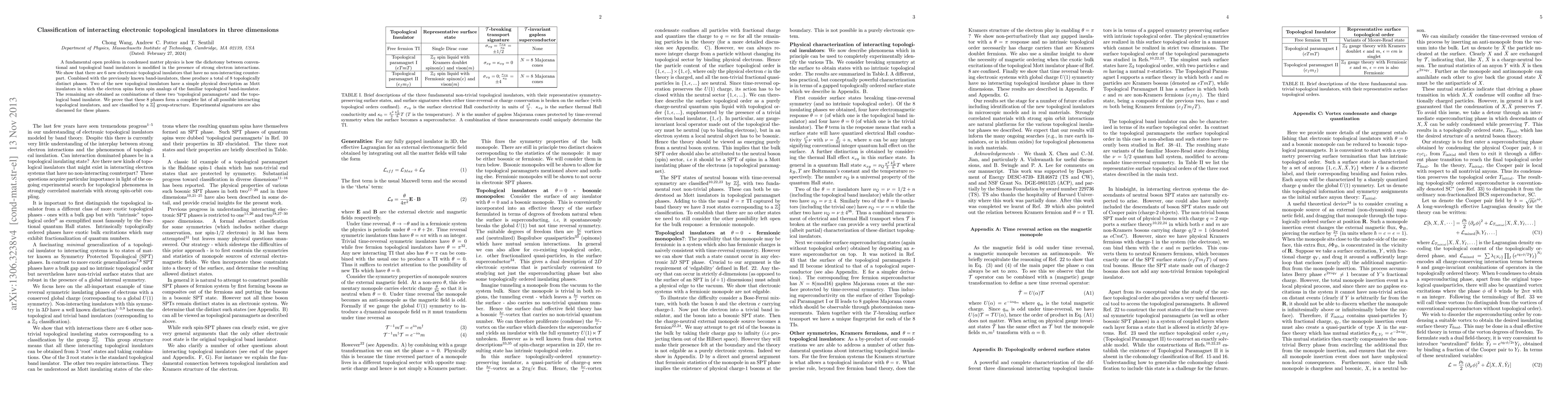 This paper classifies eight topological insulator phases in three-dimensional interacting electron systems, revealing six new phases without non-interacting counterparts. It establishes a complete classification based on a Z_2^3 group structure and discusses potential experimental signatures.