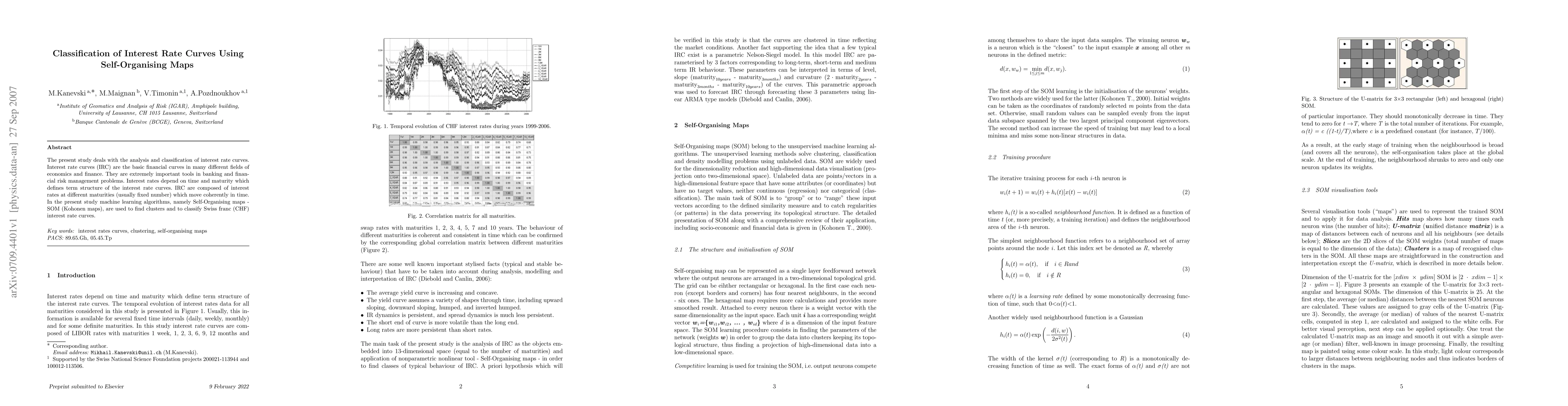 The present study deals with the analysis and classification of interest rate curves. Interest rate curves (IRC) are the basic financial curves in many different fields of economics and finance. They are extremely important tools in banking and financial risk management problems. Interest rates depend on time and maturity which defines term structure of the interest rate curves. IRC are composed of interest rates at different maturities (usually fixed number) which move coherently in time. In the present study machine learning algorithms, namely Self-Organising maps - SOM (Kohonen maps), are used to find clusters and to classify Swiss franc (CHF) interest rate curves.