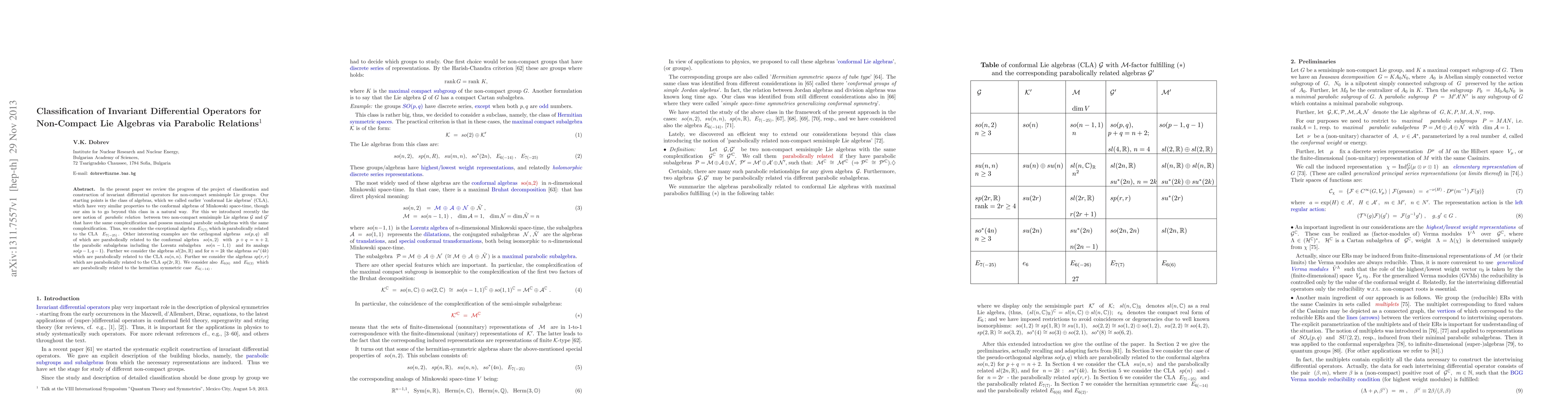 In the present paper we review the progress of the project of classification and construction of invariant differential operators for non-compact semisimple Lie groups. Our starting points is the class of algebras, which we called earlier 'conformal Lie algebras' (CLA), which have very similar properties to the conformal algebras of Minkowski space-time, though our aim is to go beyond this class in a natural way. For this we introduced recently the new notion of {\it parabolic relation} between two non-compact semisimple Lie algebras $\cal G$ and $\cal G'$ that have the same complexification and possess maximal parabolic subalgebras with the same complexification. Thus, we consider the exceptional algebra $E_{7(7)}$ which is parabolically related to the CLA $E_{7(-25)}$. Other interesting examples are the orthogonal algebras $so(p,q)$ all of which are parabolically related to the conformal algebra $so(n,2)$ with $p+q=n+2$, the parabolic subalgebras including the Lorentz subalgebra $so(n-1,1)$ and its analogs $so(p-1,q-1)$. Further we consider the algebras $sl(2n,R)$ and for $n=2k$ the algebras $su^*(4k)$ which are parabolically related to the CLA $su(n,n)$. Further we consider the algebras $sp(r,r)$ which are parabolically related to the CLA $sp(2r,R)$. We consider also $E_{6(6)}$ and $E_{6(2)}$ which are parabolically related to the hermitian symmetric case $E_{6(-14)}$.