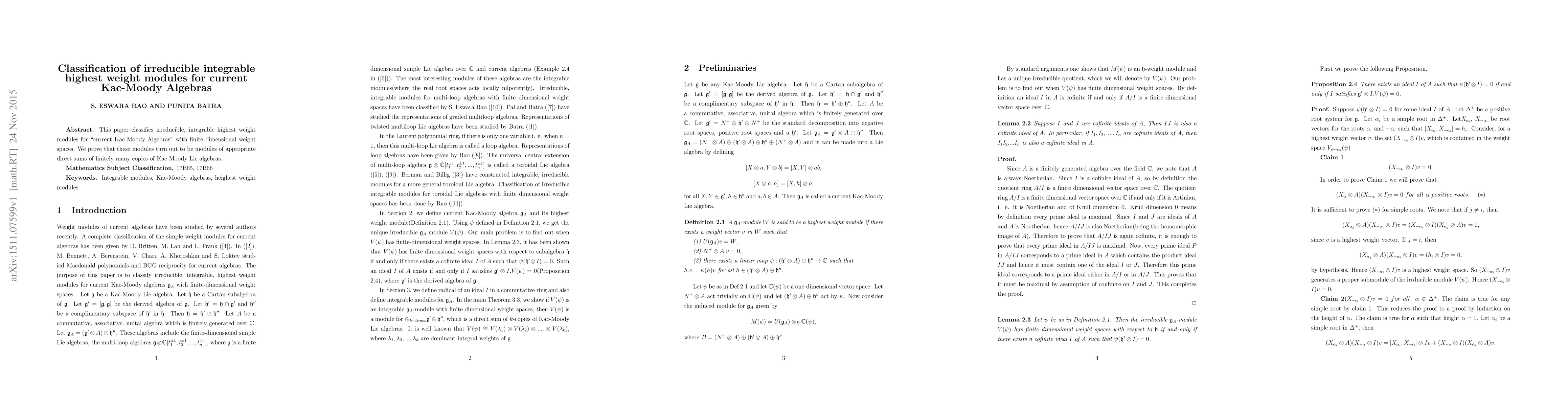 This paper classifies irreducible, integrable highest weight modules for current Kac-Moody algebras with finite-dimensional weight spaces, showing they are direct sums of finitely many copies of Kac-Moody Lie algebra modules.