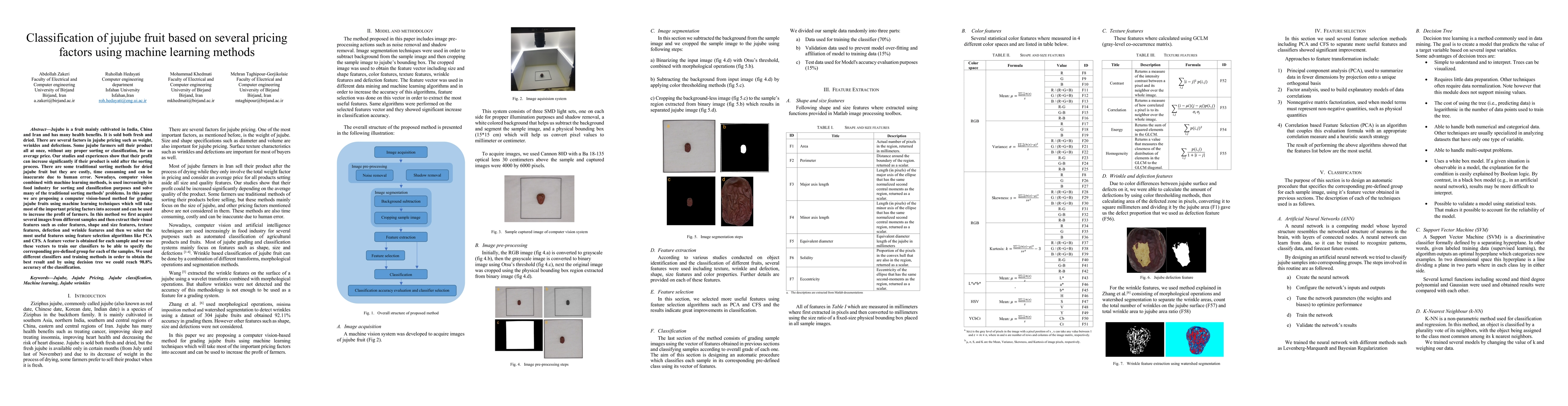 Jujube is a fruit mainly cultivated in India, China and Iran and has many health benefits. It is sold both fresh and dried. There are several factors in jujube pricing such as weight, wrinkles and defections. Some jujube farmers sell their product all at once, without any proper sorting or classification, for an average price. Our studies and experiences show that their profit can increase significantly if their product is sold after the sorting process. There are some traditional sorting methods for dried jujube fruit but they are costly, time consuming and can be inaccurate due to human error. Nowadays, computer vision combined with machine learning methods, is used increasingly in food industry for sorting and classification purposes and solve many of the traditional sorting methods' problems. In this paper we are proposing a computer vision-based method for grading jujube fruits using machine learning techniques which will take most of the important pricing factors into account and can be used to increase the profit of farmers. In this method we first acquire several images from different samples and then extract their visual features such as color features, shape and size features, texture features, defection and wrinkle features and then we select the most useful features using feature selection algorithms like PCA and CFS. A feature vector is obtained for each sample and we use these vectors to train our classifiers to be able to specify the corresponding pre-defined group for each of the samples. We used different classifiers and training methods in order to obtain the best result and by using decision tree we could reach 98.8% accuracy of the classification.