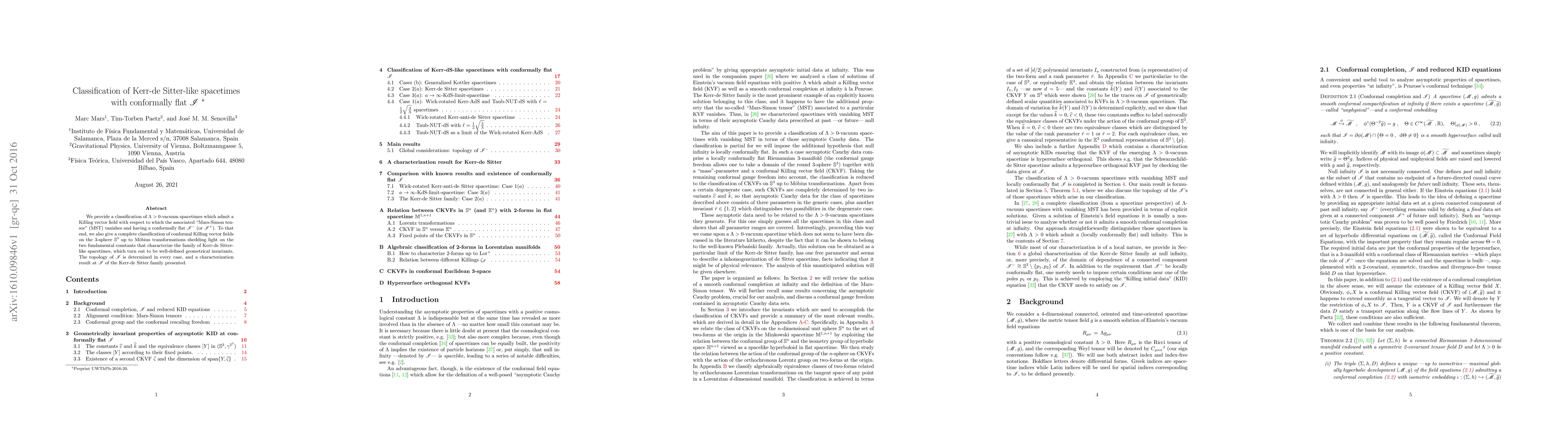 This paper classifies $\Lambda>0$-vacuum spacetimes with a vanishing Mars-Simon tensor and conformally flat future/past null infinity, revealing two fundamental geometrical invariants. The study also classifies conformal Killing vector fields on the 3-sphere up to M\"obius transformations.