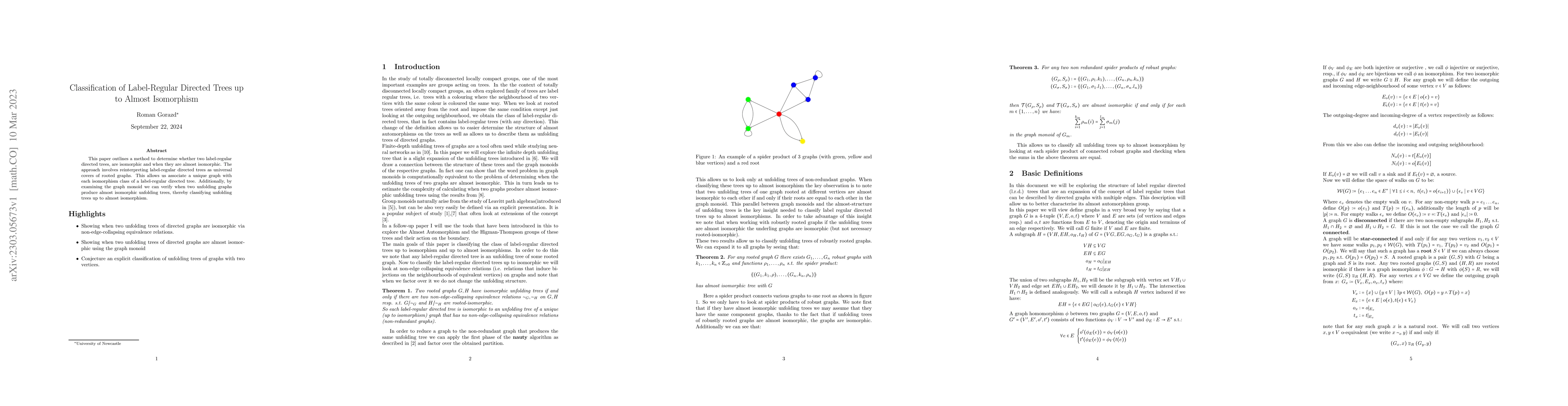 This paper proposes a method to classify label-regular directed trees up to almost isomorphism by reinterpreting them as universal covers of rooted graphs, associating a unique graph with each isomorphism class, and using the graph monoid to verify almost isomorphism.