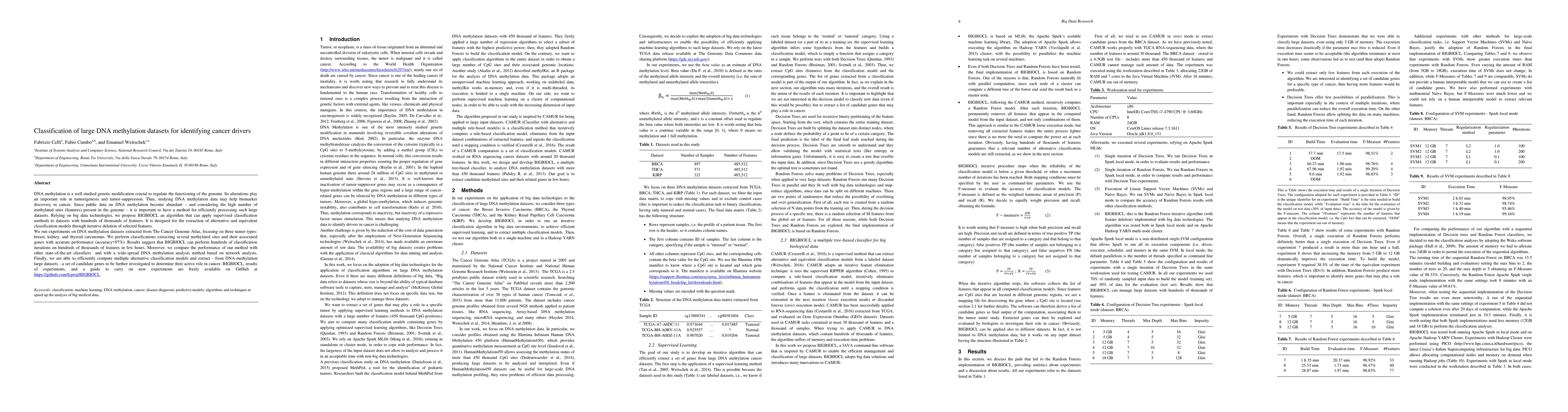 This paper proposes BIGBIOCL, an algorithm leveraging big data technologies for efficient classification of large DNA methylation datasets to identify cancer drivers. Experiments on TCGA data for breast, kidney, and thyroid carcinomas demonstrate its ability to handle hundreds of thousands of features and generate multiple alternative classification models, identifying potential cancer-related genes.