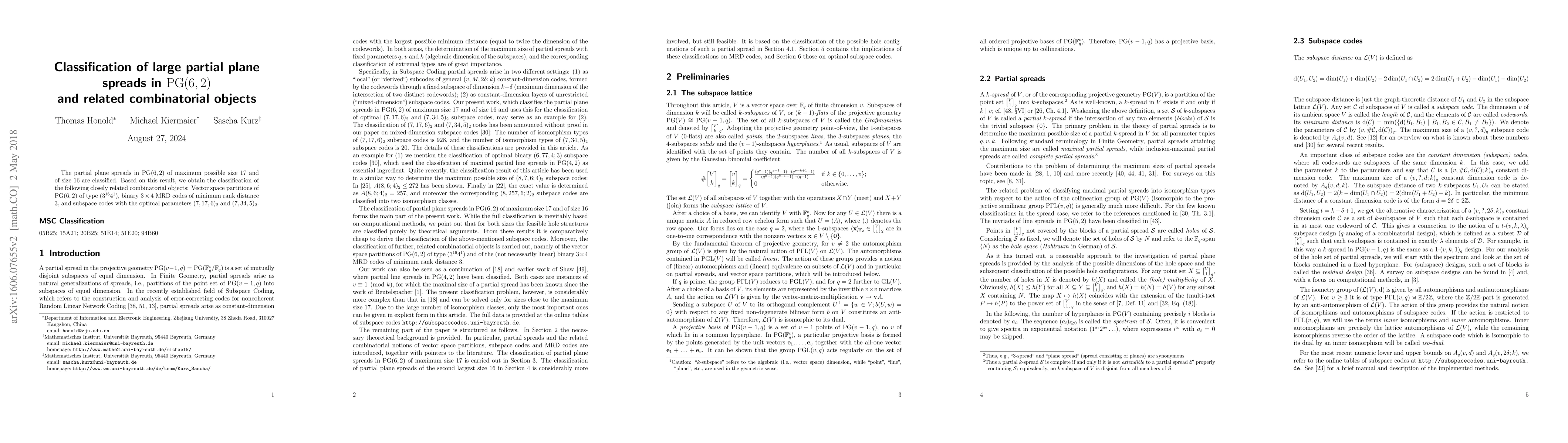 Summary: This paper classifies partial plane spreads of maximum sizes 17 and 16 in $PG(6,2)$, leading to the classification of associated vector space partitions, binary MRD codes, and specific subspace codes.