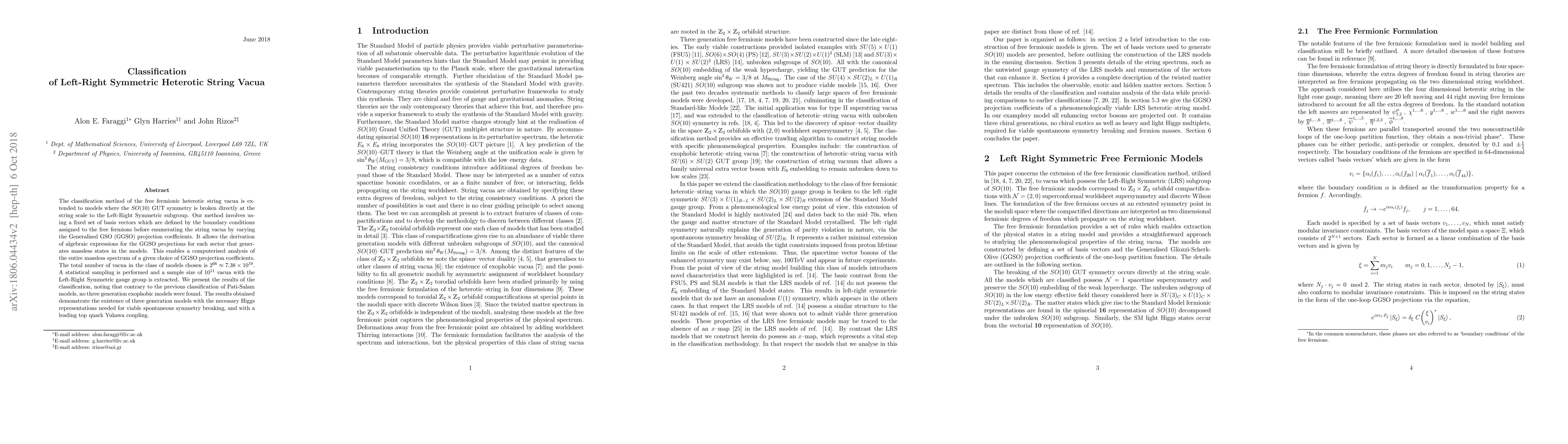 This paper classifies left-right symmetric heterotic string vacua by extending a method for free fermionic heterotic string vacua, focusing on $SO(10)$ GUT symmetry breaking to a Left-Right Symmetric subgroup. It finds no three-generation exophobic models, but does identify viable three-generation models with necessary Higgs representations for spontaneous symmetry breaking.