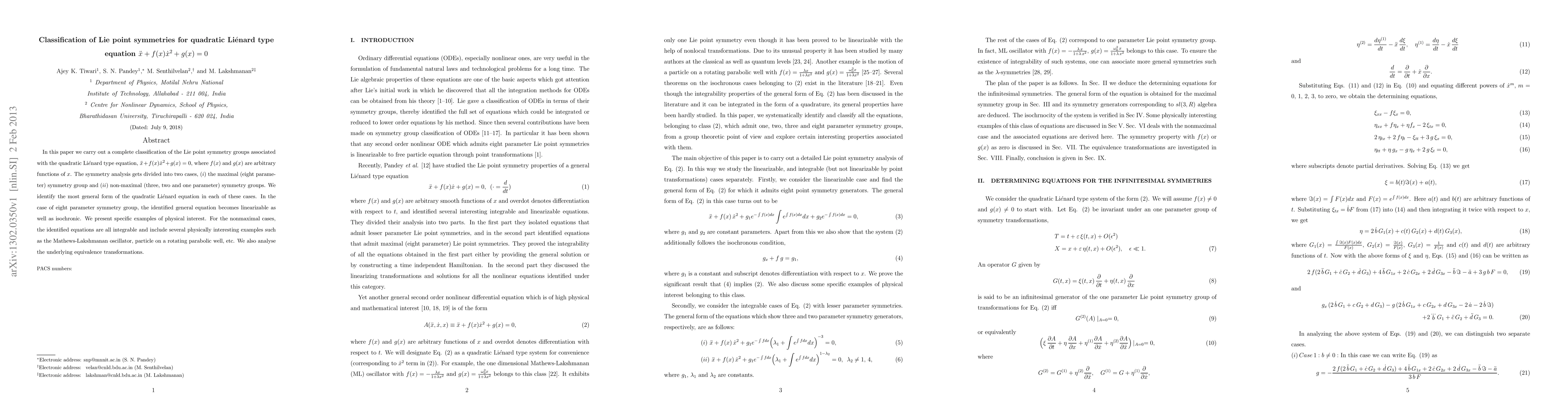 This paper classifies Lie point symmetries for the quadratic Liénard type equation, identifying maximal and non-maximal symmetry groups and their associated general forms. The maximal group linearizes and isochronicizes the equation, while non-maximal groups lead to integrable equations with physical examples.