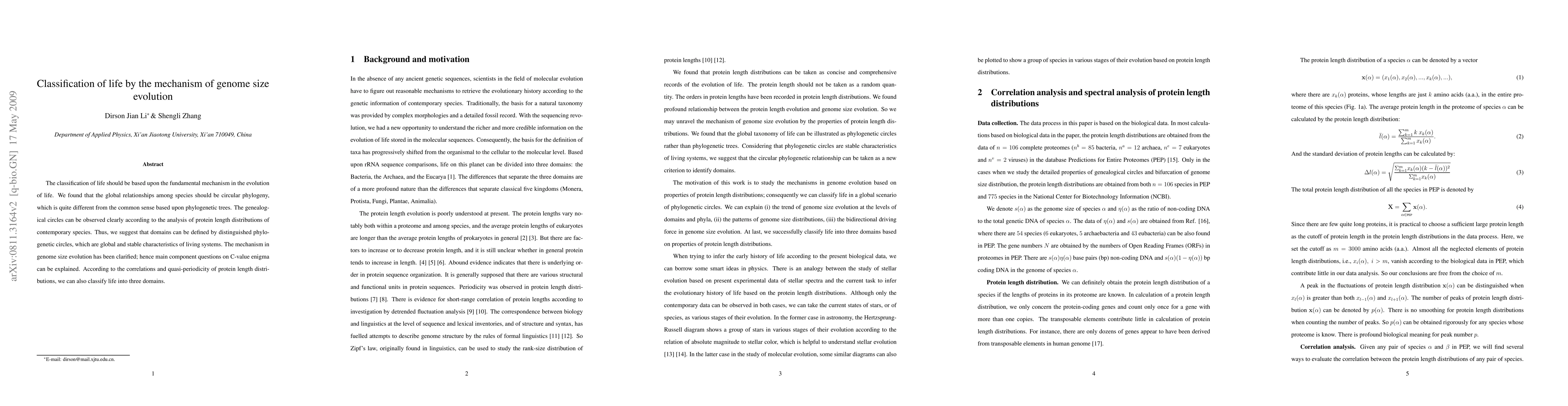 The classification of life should be based upon the fundamental mechanism in the evolution of life. We found that the global relationships among species should be circular phylogeny, which is quite different from the common sense based upon phylogenetic trees. The genealogical circles can be observed clearly according to the analysis of protein length distributions of contemporary species. Thus, we suggest that domains can be defined by distinguished phylogenetic circles, which are global and stable characteristics of living systems. The mechanism in genome size evolution has been clarified; hence main component questions on C-value enigma can be explained. According to the correlations and quasi-periodicity of protein length distributions, we can also classify life into three domains.