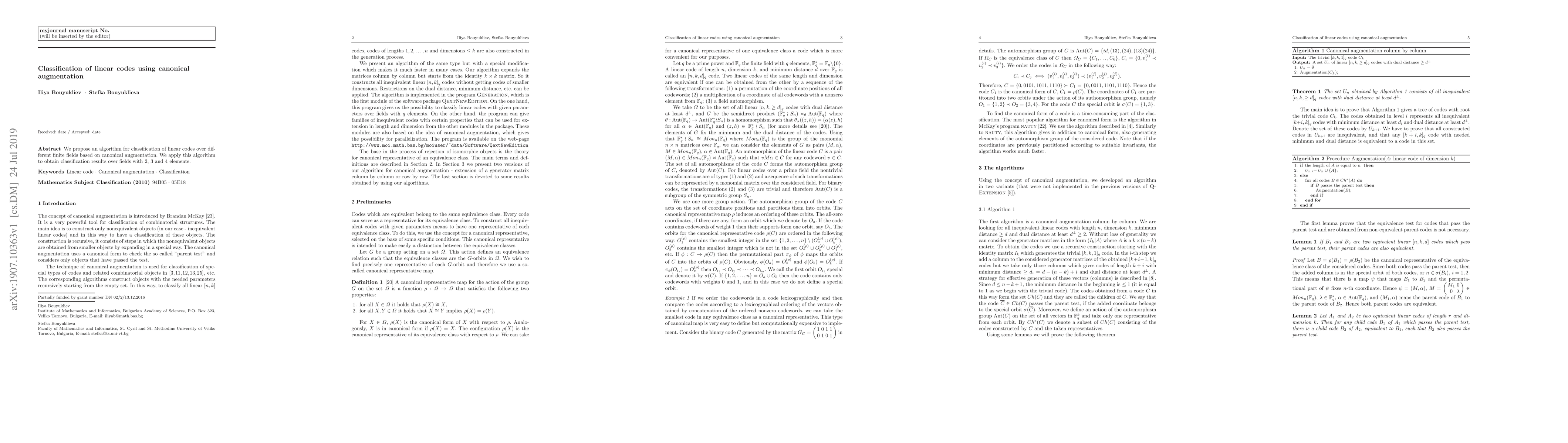 We propose an algorithm for classification of linear codes over different finite fields based on canonical augmentation. We apply this algorithm to obtain classification results over fields with 2, 3 and 4 elements.
