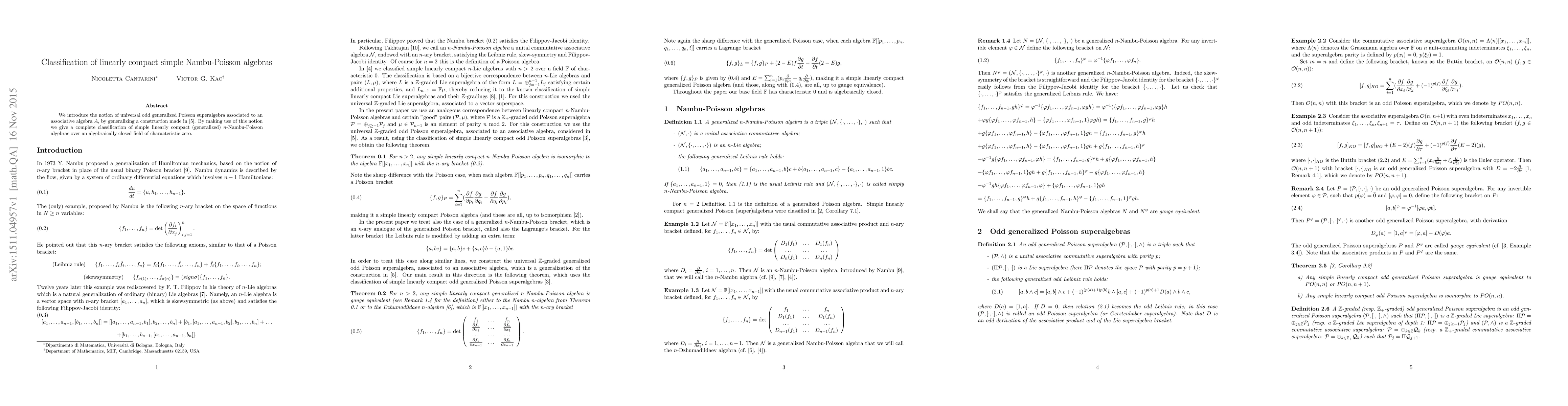 This paper introduces a universal odd generalized Poisson superalgebra linked to an associative algebra to classify simple linearly compact (generalized) n-Nambu-Poisson algebras over an algebraically closed field of characteristic zero, providing a complete classification.