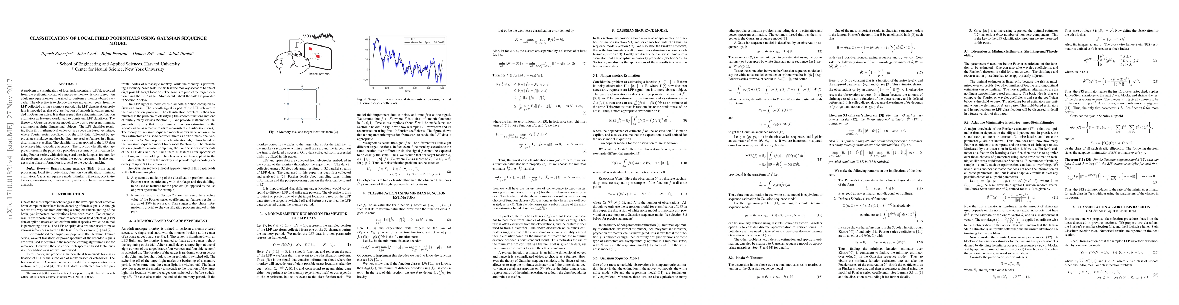 A problem of classification of local field potentials (LFPs), recorded from the prefrontal cortex of a macaque monkey, is considered. An adult macaque monkey is trained to perform a memory-based saccade. The objective is to decode the eye movement goals from the LFP collected during a memory period. The LFP classification problem is modeled as that of classification of smooth functions embedded in Gaussian noise. It is then argued that using minimax function estimators as features would lead to consistent LFP classifiers. The theory of Gaussian sequence models allows us to represent minimax estimators as finite dimensional objects. The LFP classifier resulting from this mathematical endeavor is a spectrum based technique, where Fourier series coefficients of the LFP data, followed by appropriate shrinkage and thresholding, are used as features in a linear discriminant classifier. The classifier is then applied to the LFP data to achieve high decoding accuracy. The function classification approach taken in the paper also provides a systematic justification for using Fourier series, with shrinkage and thresholding, as features for the problem, as opposed to using the power spectrum. It also suggests that phase information is crucial to the decision making.