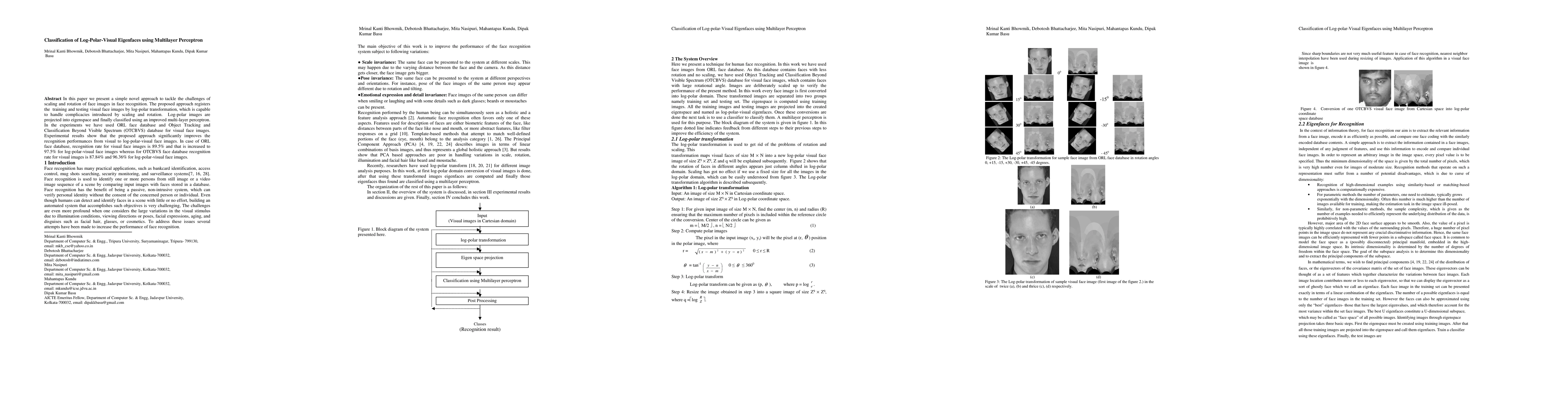 This paper proposes a novel method for face recognition that uses log-polar transformation to handle scaling and rotation challenges, projecting log-polar images into eigenspace and classifying them with an improved multilayer perceptron. The approach significantly enhances recognition performance, raising the accuracy from 89.5% to 97.5% on the ORL database and from 87.84% to 96.36% on the OTCBVS database.