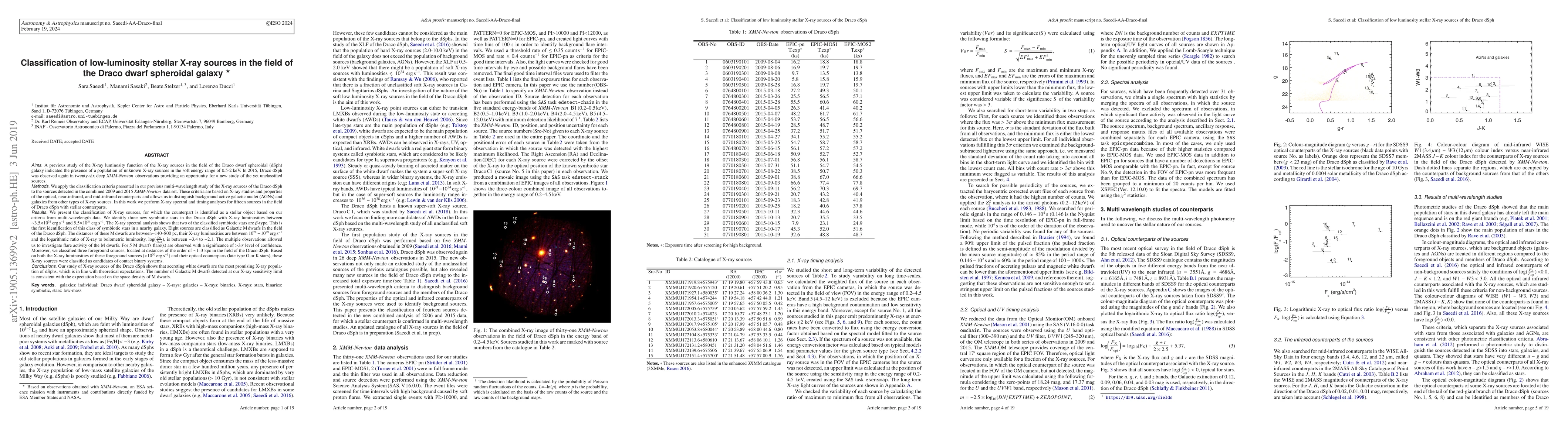 This study classifies low-luminosity stellar X-ray sources in the Draco dwarf spheroidal galaxy using combined 2009 and 2015 XMM-Newton data, identifying three new symbiotic stars and eight Galactic M dwarfs, with the latter showing significant flare activity.