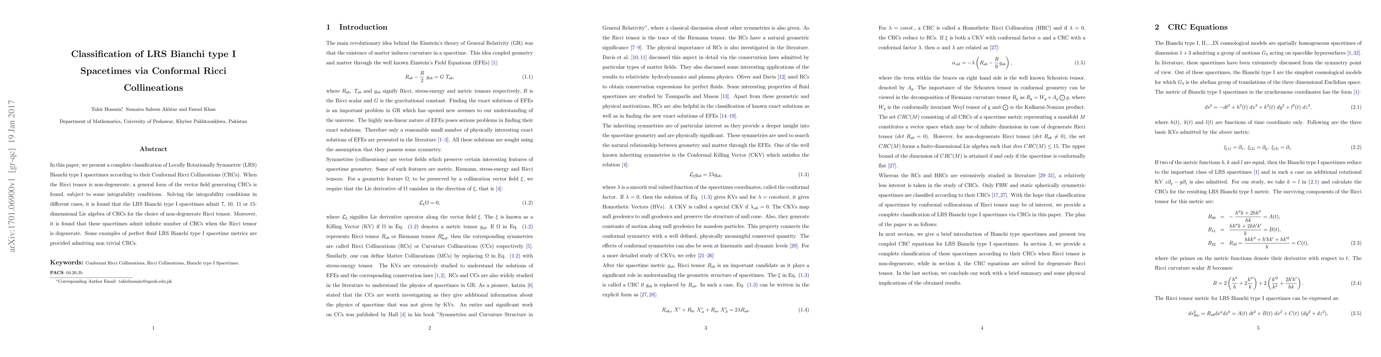 This paper classifies LRS Bianchi type I spacetimes based on their Conformal Ricci Collineations, finding that they can have 7, 10, 11, or 15-dimensional Lie algebras of CRCs when the Ricci tensor is non-degenerate, and an infinite number when it is degenerate. Examples of perfect fluid metrics with non-trivial CRCs are also presented.