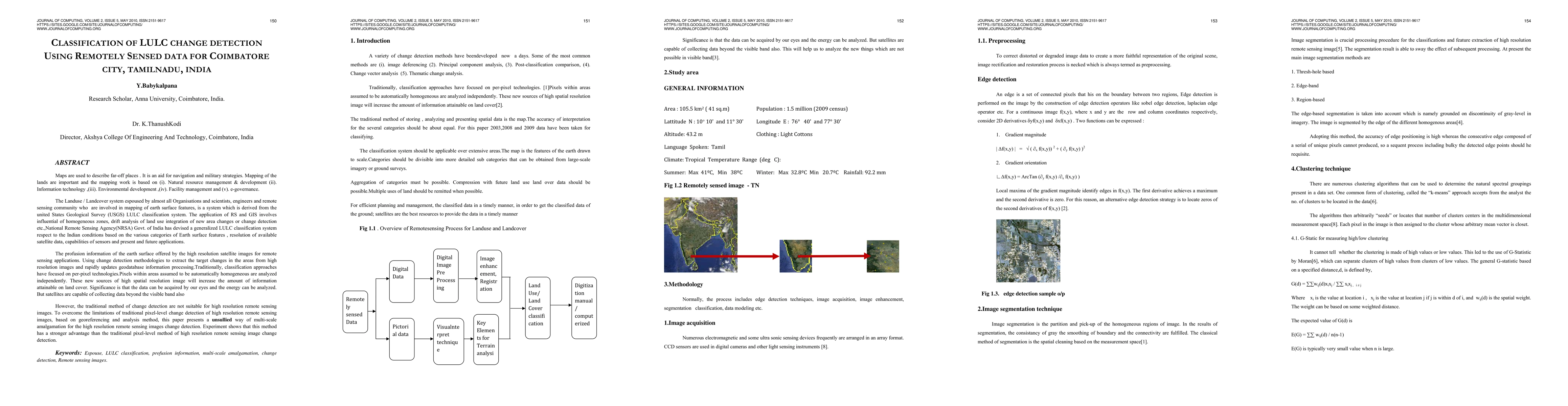 Maps are used to describe far-off places . It is an aid for navigation and military strategies. Mapping of the lands are important and the mapping work is based on (i). Natural resource management & development (ii). Information technology ,(iii). Environmental development ,(iv). Facility management and (v). e-governance. The Landuse / Landcover system espoused by almost all Organisations and scientists, engineers and remote sensing community who are involved in mapping of earth surface features, is a system which is derived from the united States Geological Survey (USGS) LULC classification system. The application of RS and GIS involves influential of homogeneous zones, drift analysis of land use integration of new area changes or change detection etc.,National Remote Sensing Agency(NRSA) Govt. of India has devised a generalized LULC classification system respect to the Indian conditions based on the various categories of Earth surface features , resolution of available satellite data, capabilities of sensors and present and future applications. The profusion information of the earth surface offered by the high resolution satellite images for remote sensing applications. Using change detection methodologies to extract the target changes in the areas from high resolution images and rapidly updates geodatabase information processing.Traditionally, classification approaches have focused on per-pixel technologies. Pixels within areas assumed to be automatically homogeneous are analyzed independently.