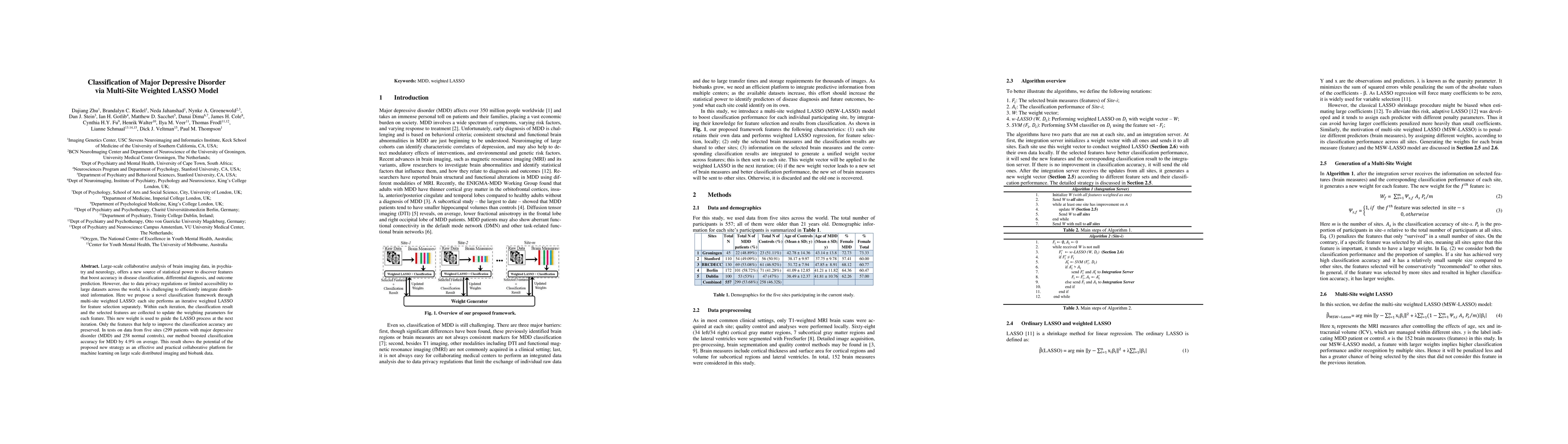 This paper proposes a multi-site weighted LASSO model to enhance the classification accuracy of Major Depressive Disorder (MDD) using distributed brain imaging data. The method iteratively selects features that improve classification, achieving a 4.9% average accuracy boost over five sites, demonstrating its potential as a collaborative platform for large-scale distributed data analysis.
