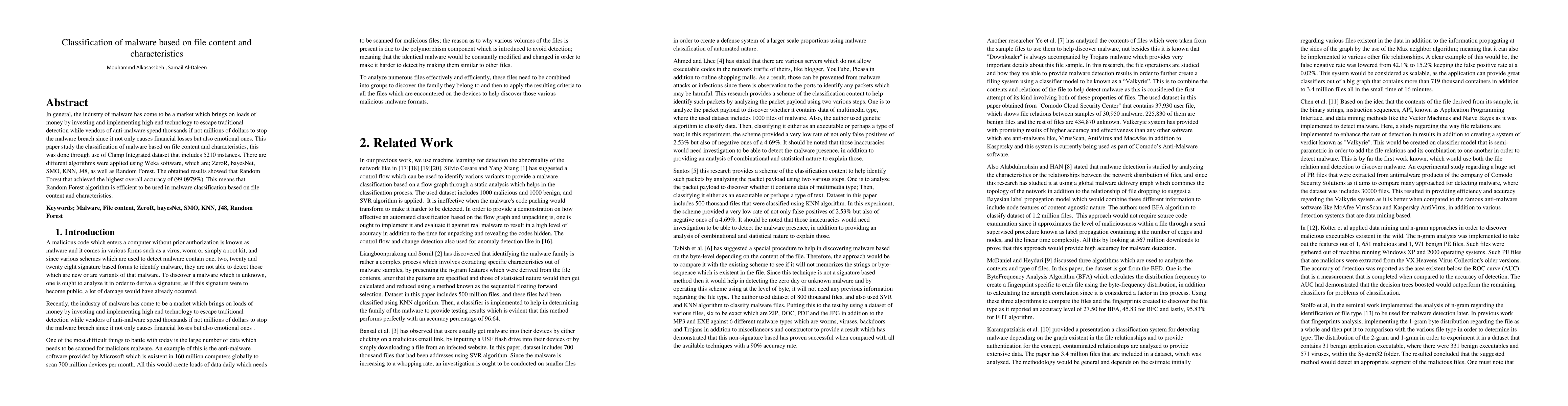 This paper explores the classification of malware using file content and characteristics, employing various algorithms on the Clamp Integrated dataset. Random Forest achieved the highest accuracy (99.0979%), demonstrating its effectiveness for malware classification.