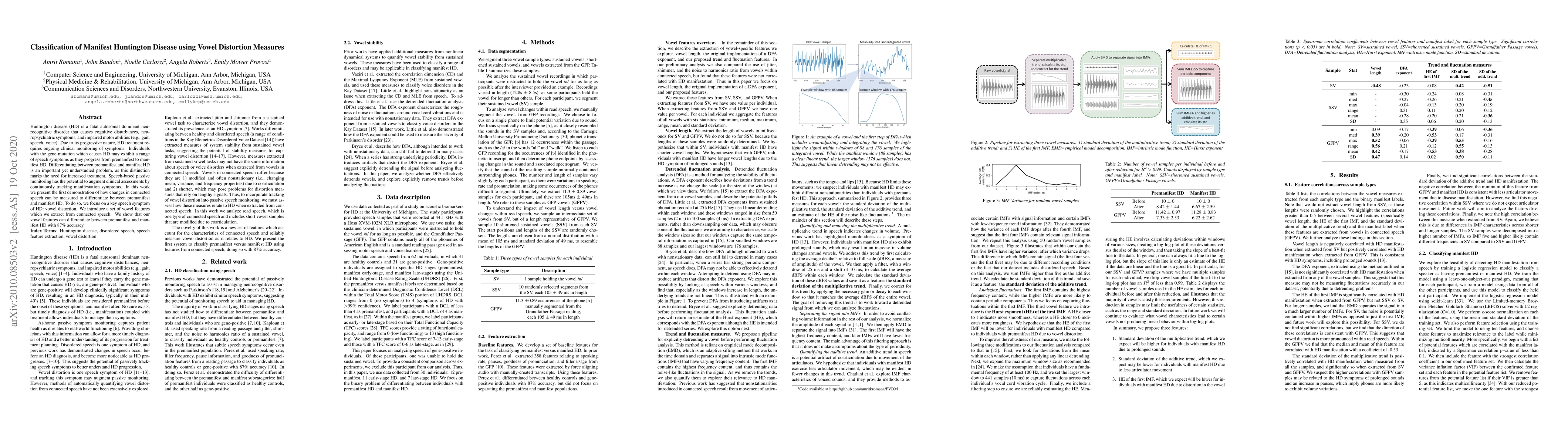 Huntington disease (HD) is a fatal autosomal dominant neurocognitive disorder that causes cognitive disturbances, neuropsychiatric symptoms, and impaired motor abilities (e.g., gait, speech, voice). Due to its progressive nature, HD treatment requires ongoing clinical monitoring of symptoms. Individuals with the gene mutation which causes HD may exhibit a range of speech symptoms as they progress from premanifest to manifest HD. Differentiating between premanifest and manifest HD is an important yet understudied problem, as this distinction marks the need for increased treatment. Speech-based passive monitoring has the potential to augment clinical assessments by continuously tracking manifestation symptoms. In this work we present the first demonstration of how changes in connected speech can be measured to differentiate between premanifest and manifest HD. To do so, we focus on a key speech symptom of HD: vowel distortion. We introduce a set of vowel features which we extract from connected speech. We show that our vowel features can differentiate between premanifest and manifest HD with 87% accuracy.