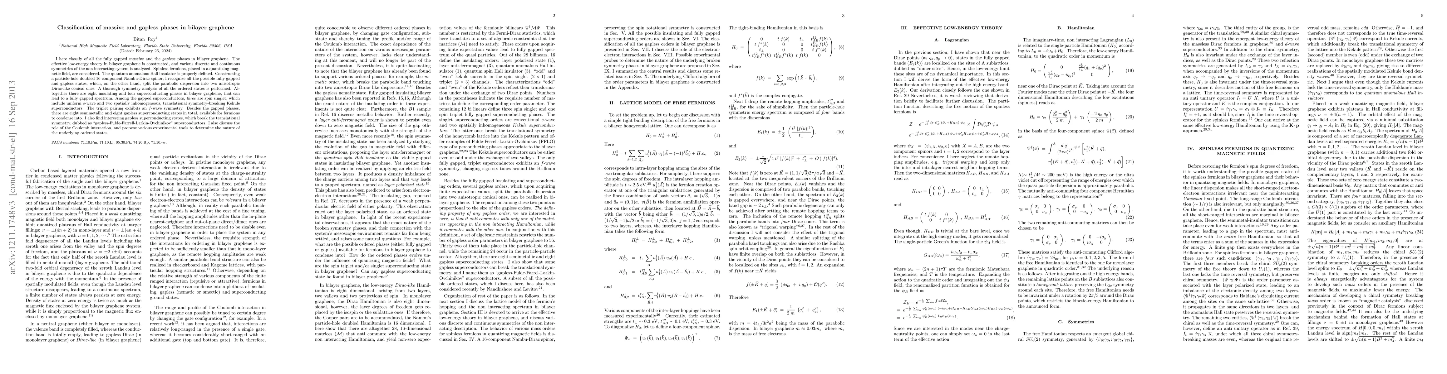 We here classify of all the fully gapped \emph{massive} and \emph{gapless} phases in bilayer graphene. The effective low energy theory in bilayer graphene is constructed, and various discrete and continuous symmetries of the non-interacting system is analyzed. Spinless fermions, placed in a quantizing magnetic field is considered. The quantum anomalous Hall insulator is properly defined. Constructing a particle-hole doubled 16 component Nambu-Dirac spinor, we recognize all the possible fully gapped, and the gapless states, which, on the other hand, split the parabolic dispersion into two anisotropic Dirac like conical ones. A thorough symmetry analysis of all the ordered states is performed. Altogether there are 8 insulating and 4 superconducting phases in bilayer graphene, that can lead to fully gapped spectrum. Among the gapped superconductors, \emph{three} are spin-singlet, which include uniform s-wave and two spatially inhomogeneous, translational symmetry breaking Kekule superconductors. The triplet pairing exhibits an f-wave symmetry. Besides the gapped phases, there are 8 semimetallic and 8 gapless superconducting states in total, available for fermions to condense into. We also find novel gapless superconducting states, which break the translational symmetry, dubbed as \emph{gapless-Fulde-Farrell-Larkin-Ovchinikov} superconductors. We also discuss the role of Coulomb interaction, and propose various experimental tools to determine the underlying ordered states.
