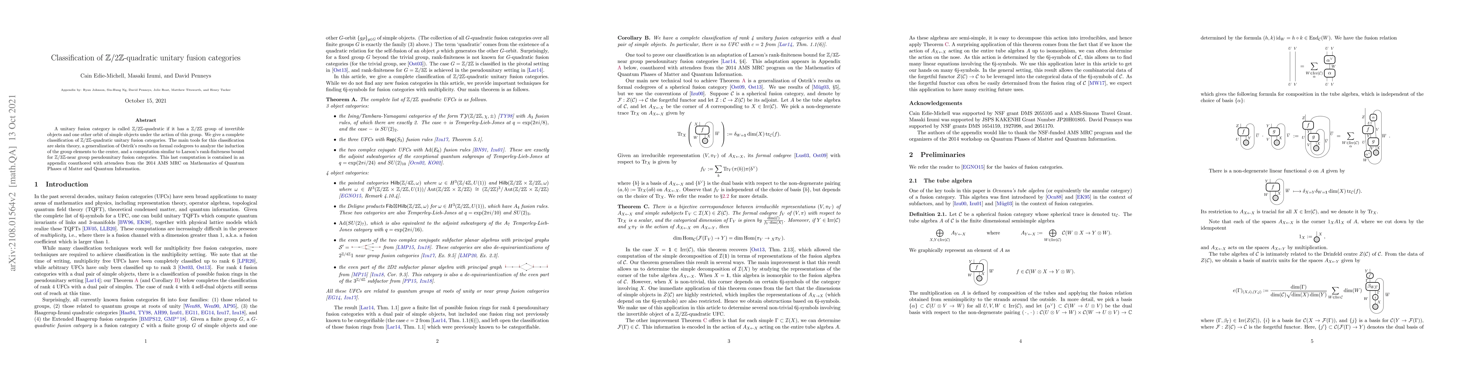 This paper provides a complete classification of $\mathbb{Z}/2\mathbb{Z}$-quadratic unitary fusion categories, utilizing skein theory, formal codegrees, and a rank-finiteness computation, with contributions from the 2014 AMS MRC on Quantum Phases of Matter and Information.