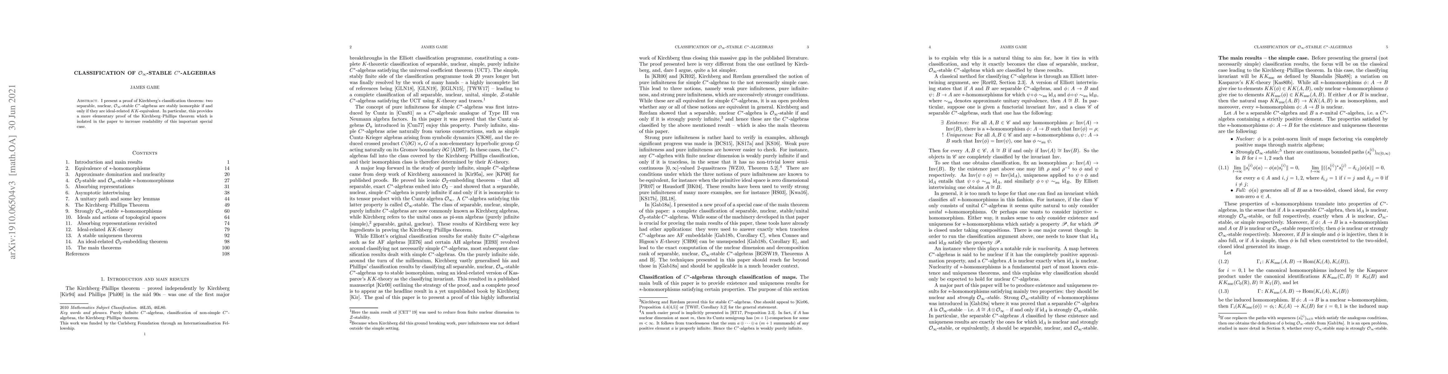Summary: This paper proves Kirchberg's classification theorem for separable, nuclear, $\mathcal O_\infty$-stable $C^\ast$-algebras, showing they are stably isomorphic if and only if they are ideal-related $KK$-equivalent, with an emphasis on simplifying the proof for the Kirchberg--Phillips theorem for enhanced readability.