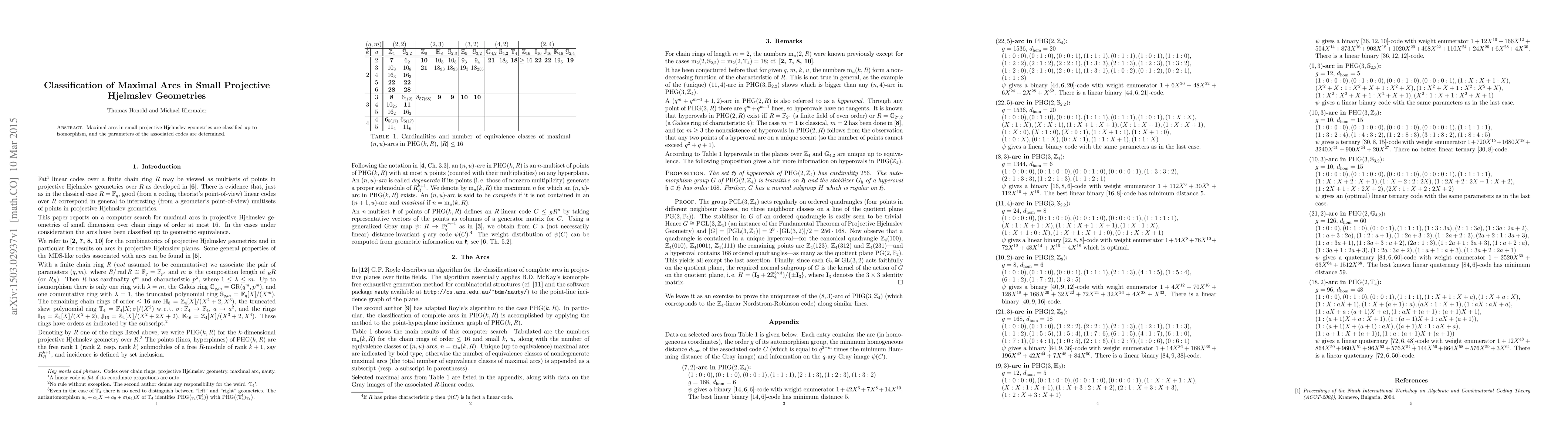 Maximal arcs in small projective Hjelmslev geometries are classified up to isomorphism, and the parameters of the associated codes are determined.