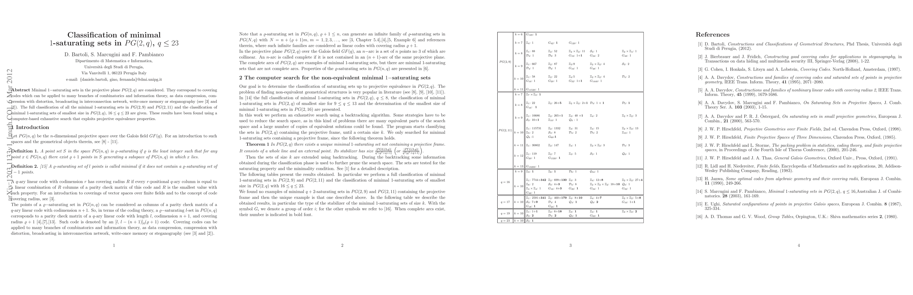 Minimal 1-saturating sets in the projective plane $PG(2,q)$ are considered. They correspond to covering codes which can be applied to many branches of combinatorics and information theory, as data compression, compression with distortion, broadcasting in interconnection network, write-once memory or steganography (see \cite{Coh} and \cite{BF2008}). The full classification of all the minimal 1-saturating sets in PG(2,9) and PG(2,11) and the classification of minimal 1-saturating sets of smallest size in PG(2,q), $16\leq q\leq 23$ are given. These results have been found using a computer-based exhaustive search that exploits projective equivalence properties.