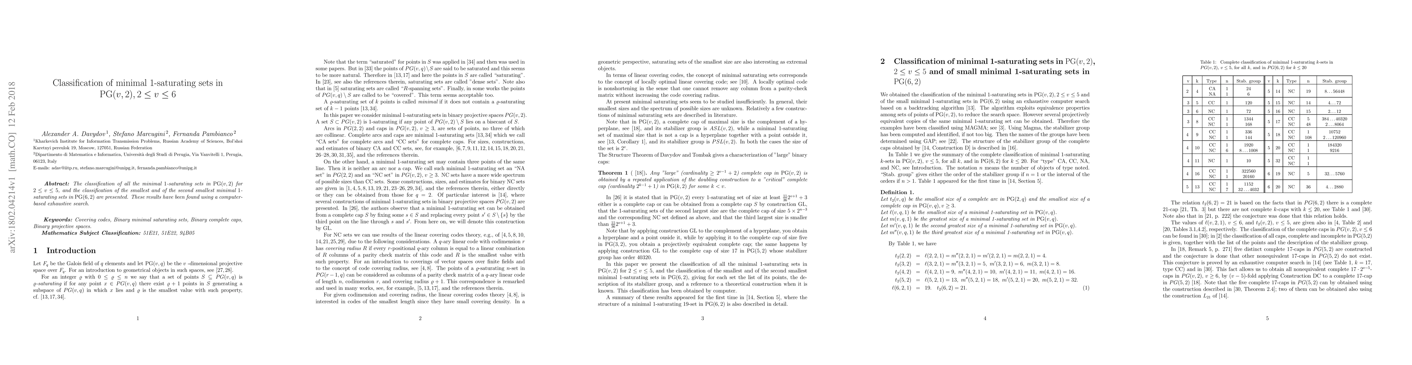 This paper classifies minimal 1-saturating sets in projective geometries PG(v, 2) for dimensions 2 ≤ v ≤ 6, detailing results obtained via exhaustive computer search, including the smallest and second smallest sets for PG(6, 2).