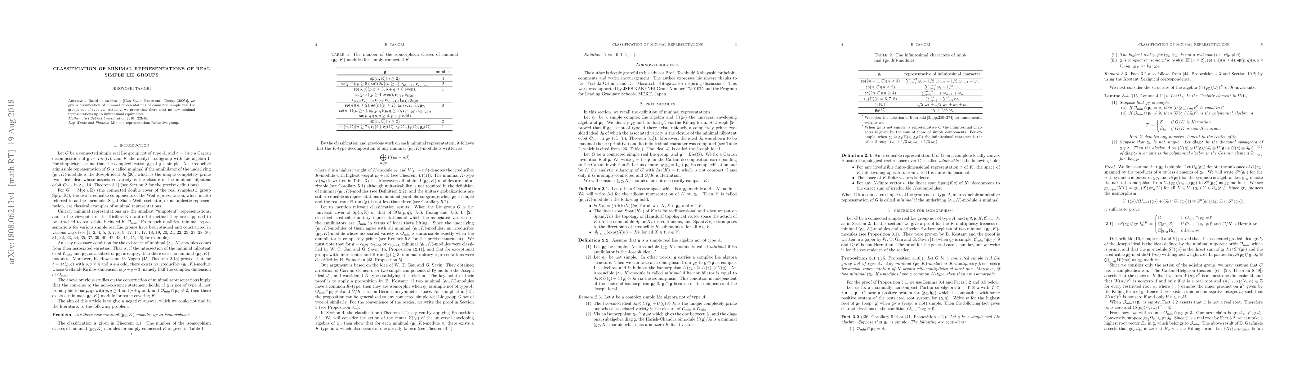 The paper classifies minimal representations of connected simple real Lie groups not of type A, proving there are no new minimal representations up to infinitesimal equivalence.