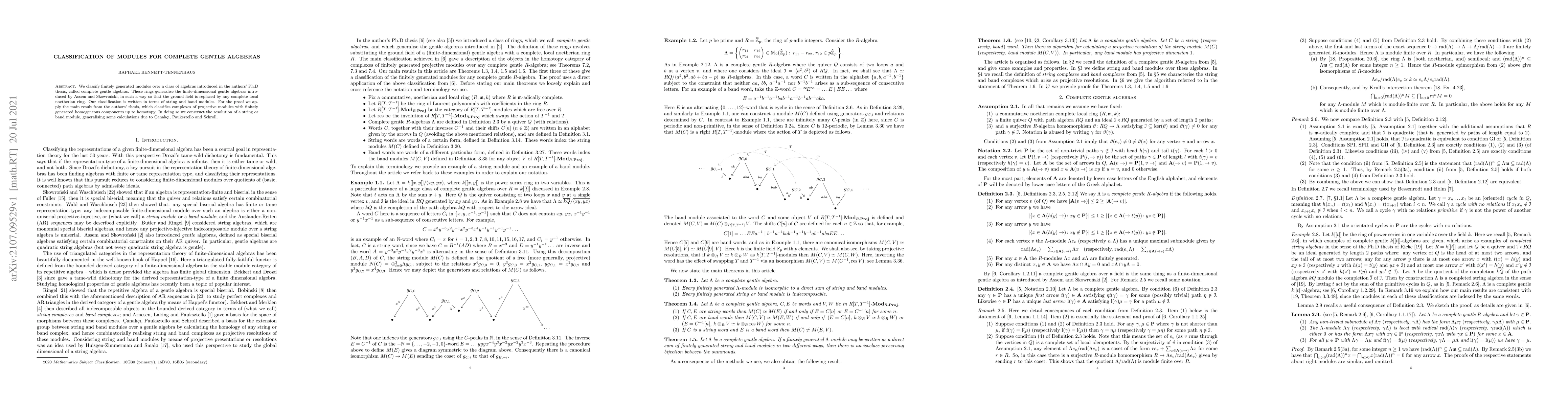 We classify finitely generated modules over a class of algebras introduced in the authors' Ph.D thesis, called complete gentle algebras. These rings generalise the finite-dimensional gentle algebras introduced by Assem and Skowro\'{n}ski, in such a way so that the ground field is replaced by any complete local noetherian ring. Our classification is written in terms of string and band modules. For the proof we apply the main result from the authors' thesis, which classifies complexes of projective modules with finitely generated homogeneous components up to homotopy. In doing so we construct the resolution of a string or band module, generalising some calculations due to \c{C}anak\c{c}i, Pauksztello and Schroll.