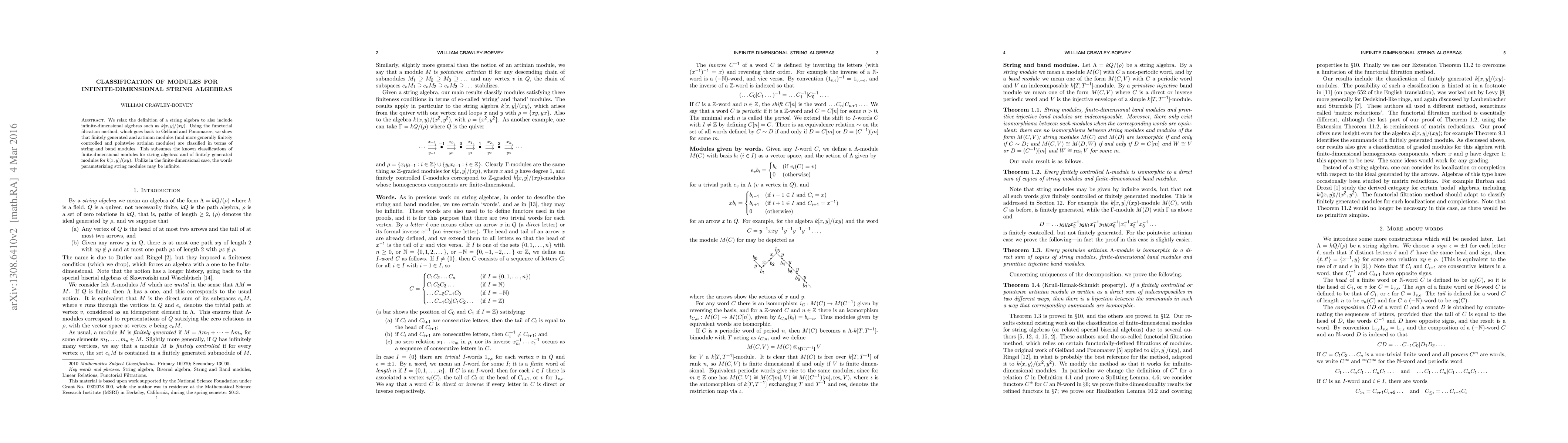 We relax the definition of a string algebra to also include infinite-dimensional algebras such as k[x,y]/(xy). Using the functorial filtration method, which goes back to Gelfand and Ponomarev, we show that finitely generated and artinian modules (and more generally finitely controlled and pointwise artinian modules) are classified in terms of string and band modules. This subsumes the known classifications of finite-dimensional modules for string algebras and of finitely generated modules for k[x,y]/(xy). Unlike in the finite-dimensional case, the words parameterizing string modules may be infinite.