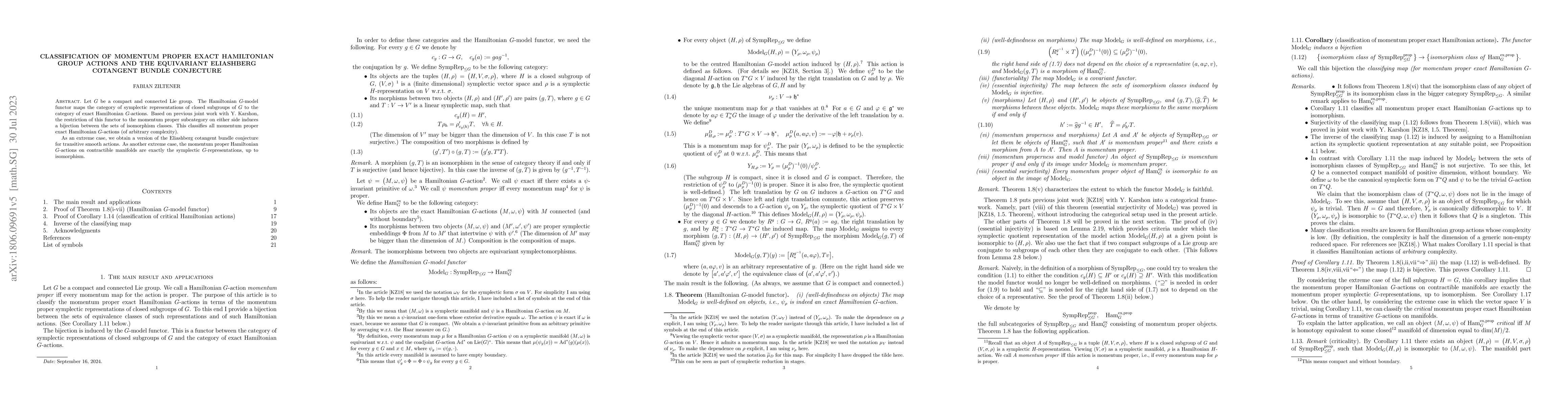 Let $G$ be a compact and connected Lie group. The Hamiltonian $G$-model functor maps the category of symplectic representations of closed subgroups of $G$ to the category of exact Hamiltonian $G$-actions. Based on previous joint work with Y. Karshon, the restriction of this functor to the momentum proper subcategory on either side induces a bijection between the sets of isomorphism classes. This classifies all momentum proper exact Hamiltonian $G$-actions (of arbitrary complexity). As an extreme case, we obtain a version of the Eliashberg cotangent bundle conjecture for transitive smooth actions. As another extreme case, the momentum proper Hamiltonian $G$-actions on contractible manifolds are exactly the symplectic $G$-representations, up to isomorphism.