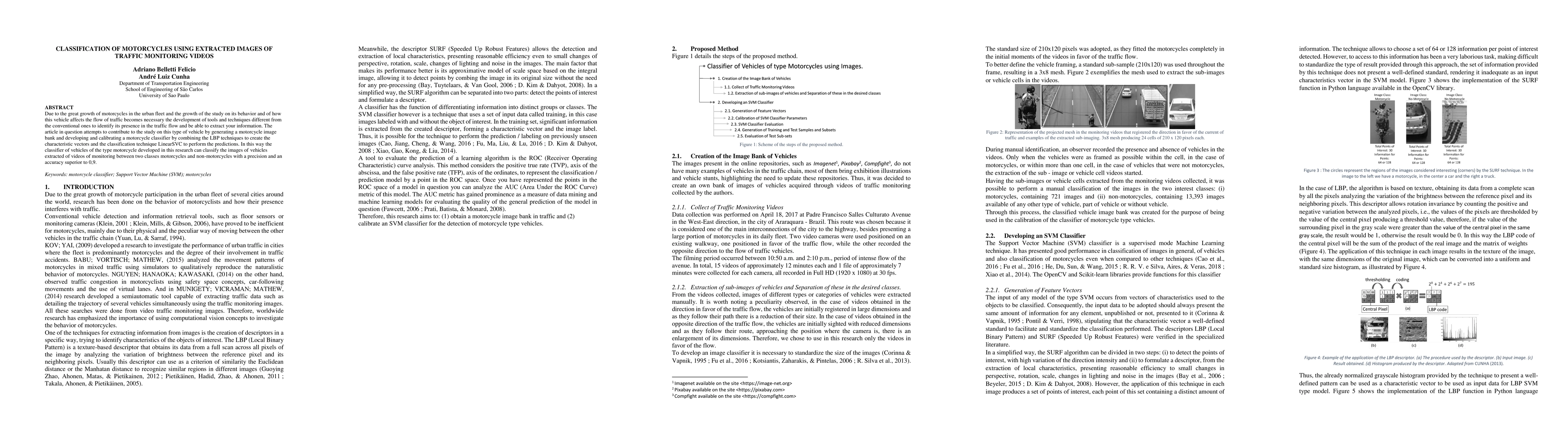 Due to the great growth of motorcycles in the urban fleet and the growth of the study on its behavior and of how this vehicle affects the flow of traffic becomes necessary the development of tools and techniques different from the conventional ones to identify its presence in the traffic flow and be able to extract your information. The article in question attempts to contribute to the study on this type of vehicle by generating a motorcycle image bank and developing and calibrating a motorcycle classifier by combining the LBP techniques to create the characteristic vectors and the classification technique LinearSVC to perform the predictions. In this way the classifier of vehicles of the type motorcycle developed in this research can classify the images of vehicles extracted of videos of monitoring between two classes motorcycles and non-motorcycles with a precision and an accuracy superior to 0,9.