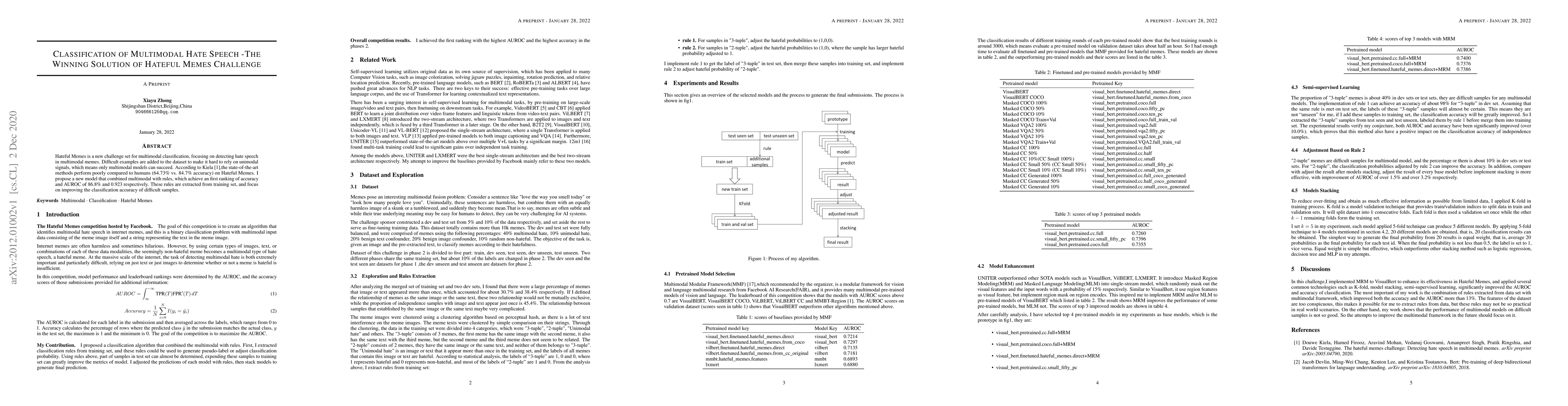 The research presents a winning solution for the Hateful Memes Challenge, introducing a new multimodal model combining advanced techniques with extracted rules to achieve 86.8% accuracy and 0.923 AUROC, outperforming state-of-the-art methods and human performance. The model focuses on improving classification of challenging examples by leveraging both multimodal signals and rule-based insights.