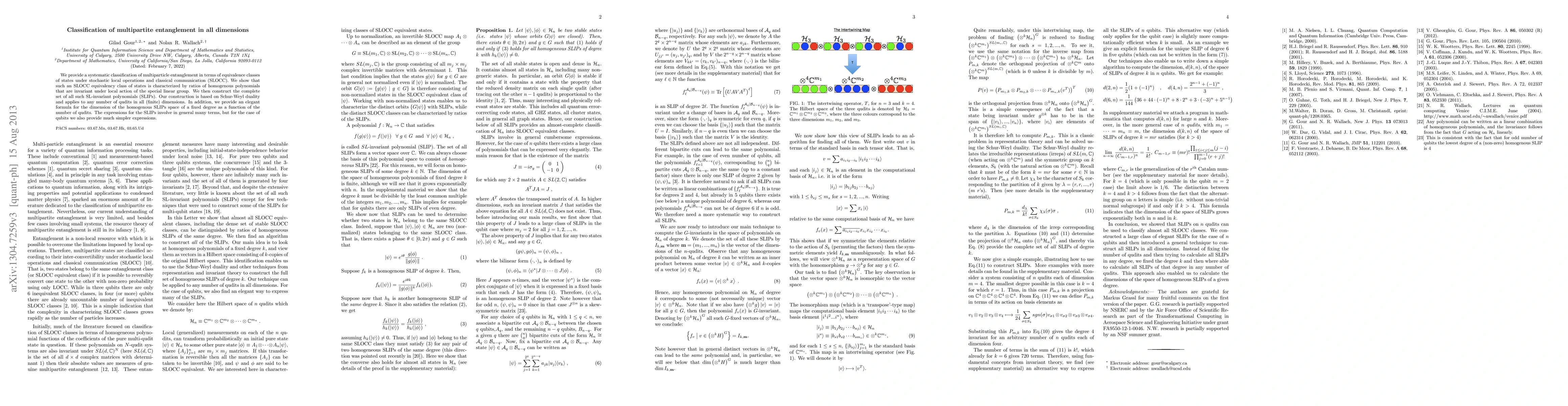 We provide a systematic classification of multiparticle entanglement in terms of equivalence classes of states under stochastic local operations and classical communication (SLOCC). We show that such an SLOCC equivalency class of states is characterized by ratios of homogenous polynomials that are invariant under local action of the special linear group. We then construct the complete set of all such SL-invariant polynomials (SLIPs). Our construction is based on Schur-Weyl duality and applies to any number of qudits in all (finite) dimensions. In addition, we provide an elegant formula for the dimension of the homogenous SLIPs space of a fixed degree as a function of the number of qudits. The expressions for the SLIPs involve in general many terms, but for the case of qubits we also provide much simpler expressions.