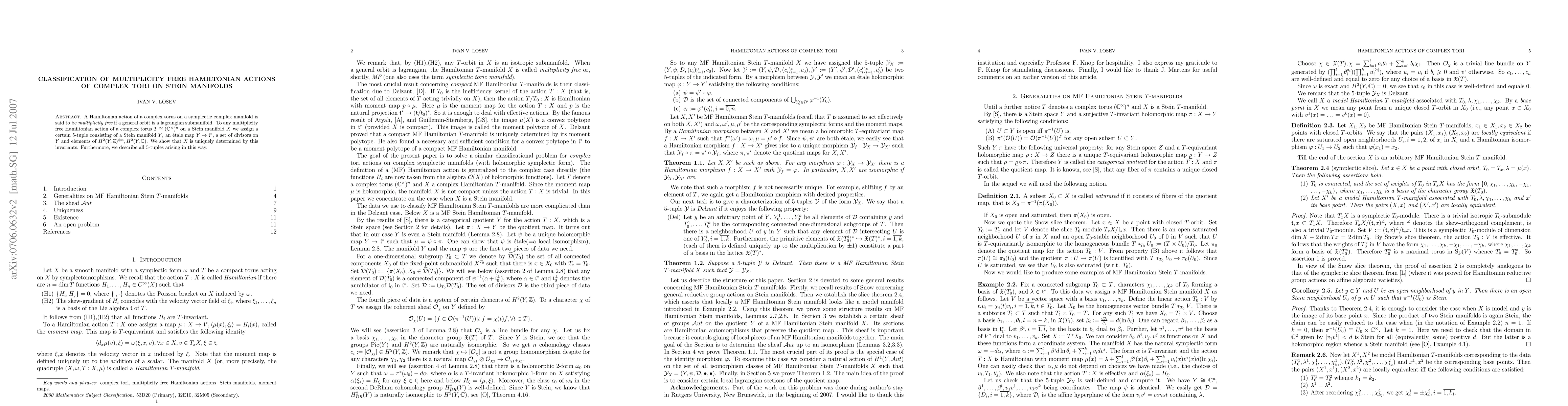This paper classifies multiplicity free Hamiltonian actions of complex tori on Stein manifolds by assigning invariant 5-tuples, showing that each Stein manifold $X$ is uniquely determined by these invariants, and providing a complete description of all possible 5-tuples.