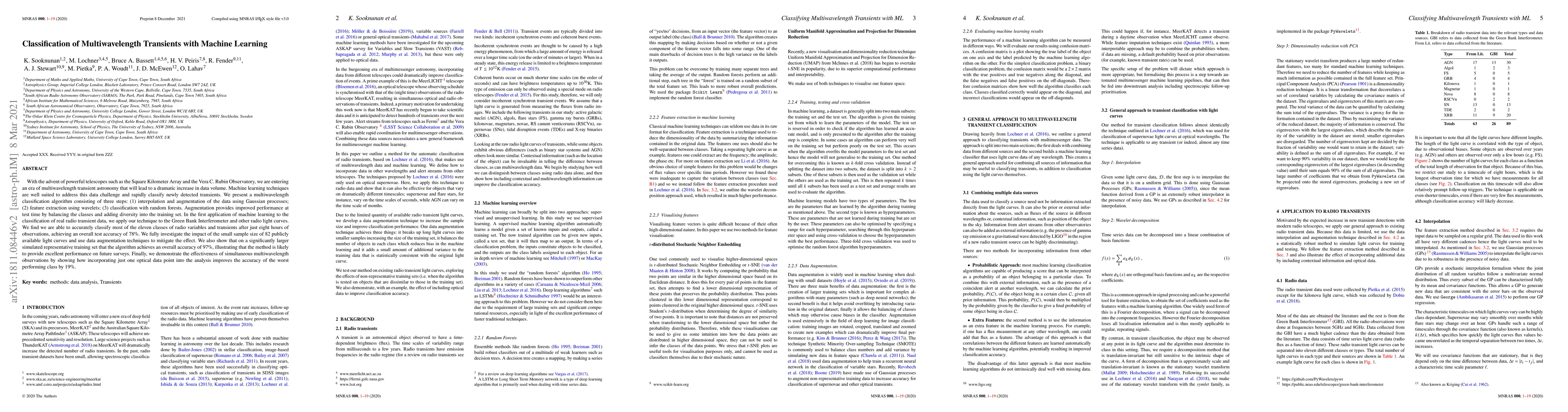 This paper presents a machine learning algorithm for classifying multiwavelength transients using Gaussian processes for data augmentation, wavelets for feature extraction, and random forests for classification. The method achieves 78% accuracy with real radio data and 97% with a larger simulated dataset, demonstrating its potential for future surveys and the benefit of incorporating optical data.