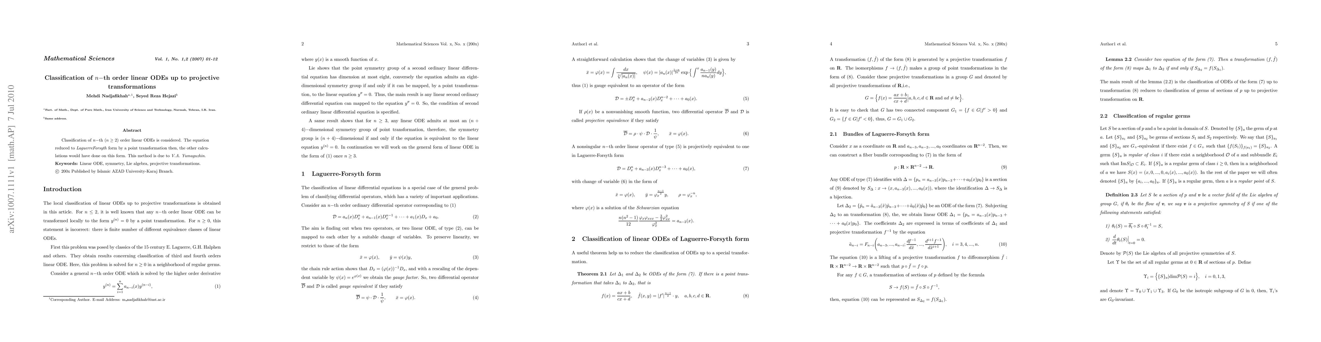 This paper classifies $n$-th order linear ODEs (for $n\geq2$) by reducing them to Laguerre-Forsyth form via projective transformations, employing a method developed by V.A. Yumaguzhin. The classification process focuses on simplifying the equations for further analysis.