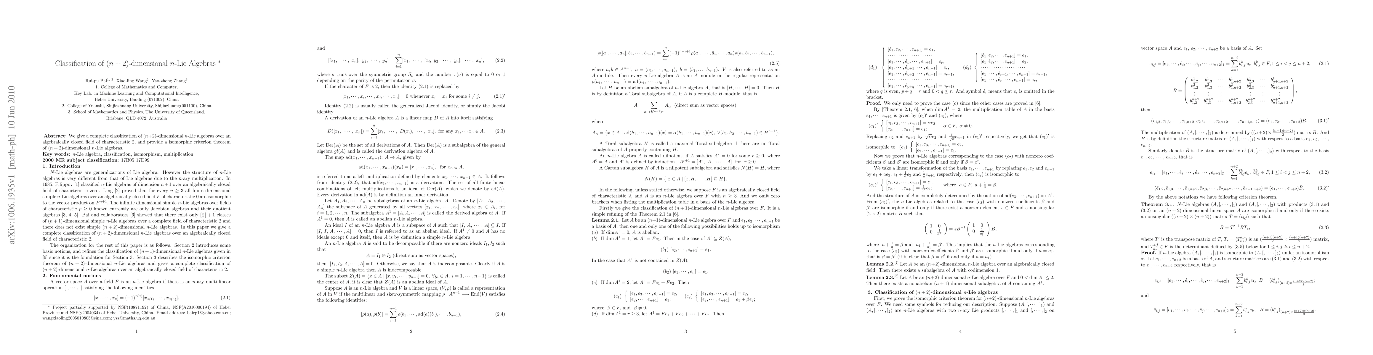Summary: This paper presents a thorough classification of (n+2)-dimensional n-Lie algebras over an algebraically closed field of characteristic 2, alongside a criterion for establishing isomorphisms among these algebras.