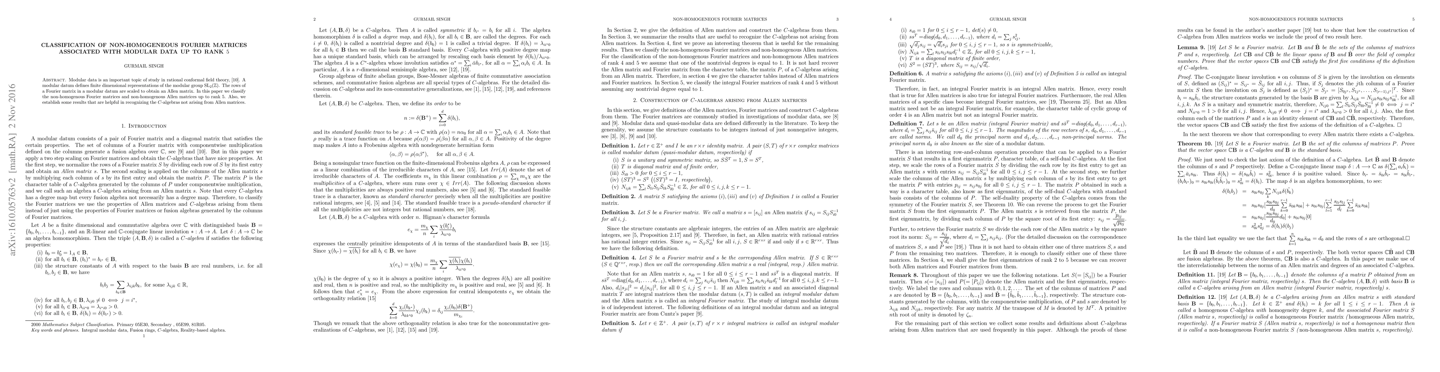 Modular data is an important topic of study in rational conformal field theory. A modular datum defines finite dimensional representations of the modular group $\mbox{SL}_2(\mathbf{Z})$. For every Fourier matrix in a modular datum there exists an Allen matrix obtained from the Fourier matrix after dividing each its row with the first entry of that row. In this paper, we classify the non-homogenous Fourier matrices and non-homogenous Allen matrices up to rank $5$. The methods developed here are useful for the classification of the matrices of higher ranks. Also, we establish some results that are helpful in recognizing the $C$-algebras not arising from Allen matrices by just looking at the character table of the $C$-algebra, in particular, the first row of the character table.