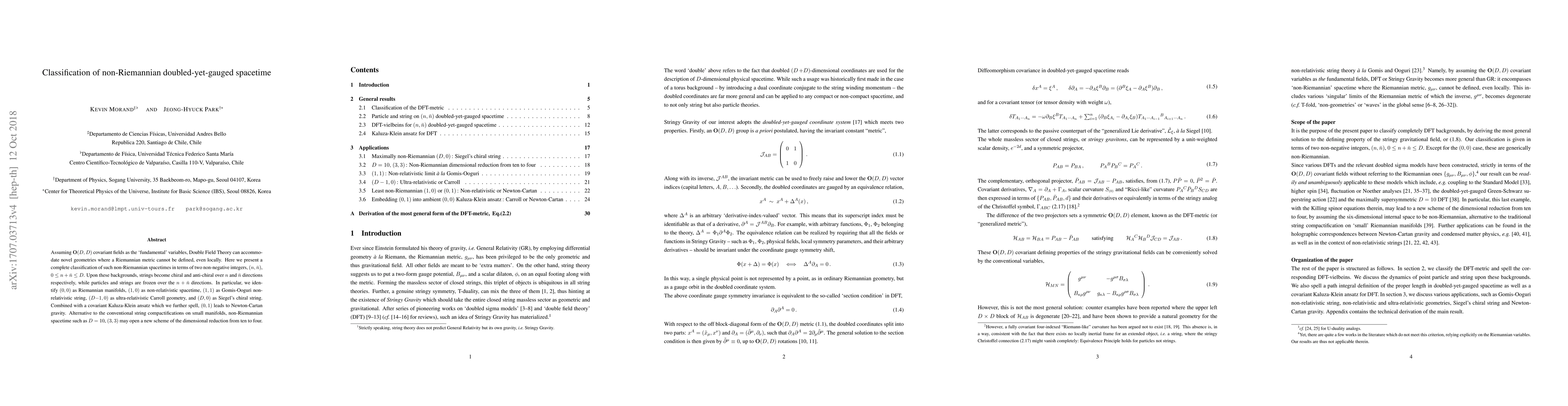 This paper classifies novel non-Riemannian spacetimes using Double Field Theory, characterized by integers $(n,\bar{n})$, and identifies specific geometries like non-relativistic and ultra-relativistic spacetimes. It proposes a new dimensional reduction scheme from ten to four dimensions.