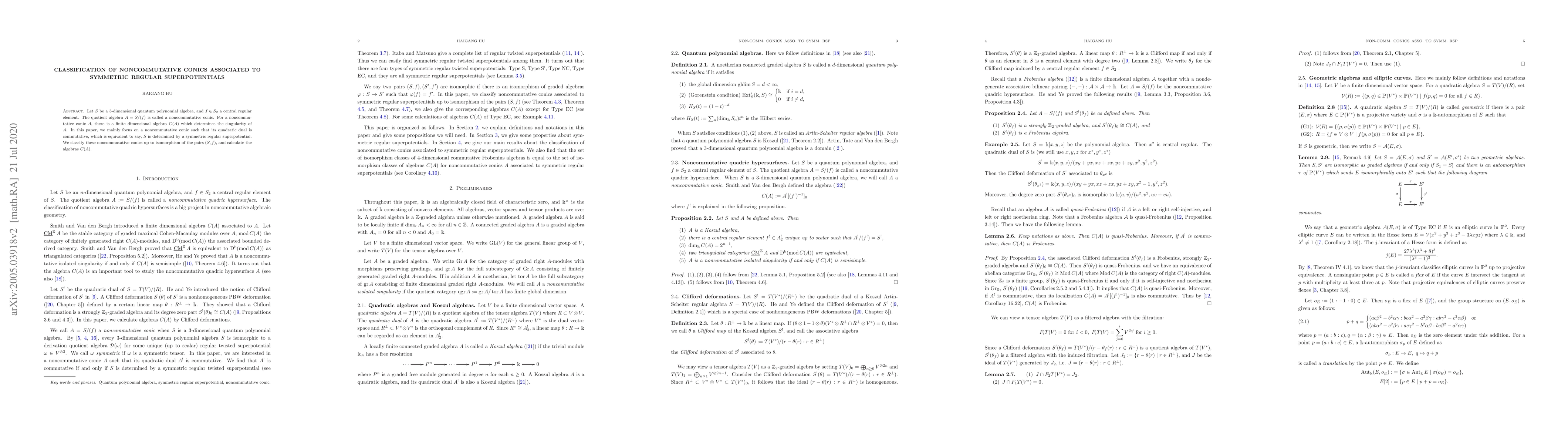 Let $S$ be a $3$-dimensional quantum polynomial algebra, and $f \in S_2$ a central regular element. The quotient algebra $A = S/(f)$ is called a noncommutative conic. For a noncommutative conic $A$, there is a finite dimensional algebra $C(A)$ which determines the singularity of $A$. In this paper, we mainly focus on a noncommutative conic such that its quadratic dual is commutative, which is equivalent to say, $S$ is determined by a symmetric regular superpotential. We classify these noncommutative conics up to isomorphism of the pairs $(S,f)$, and calculate the algebras $C(A)$.