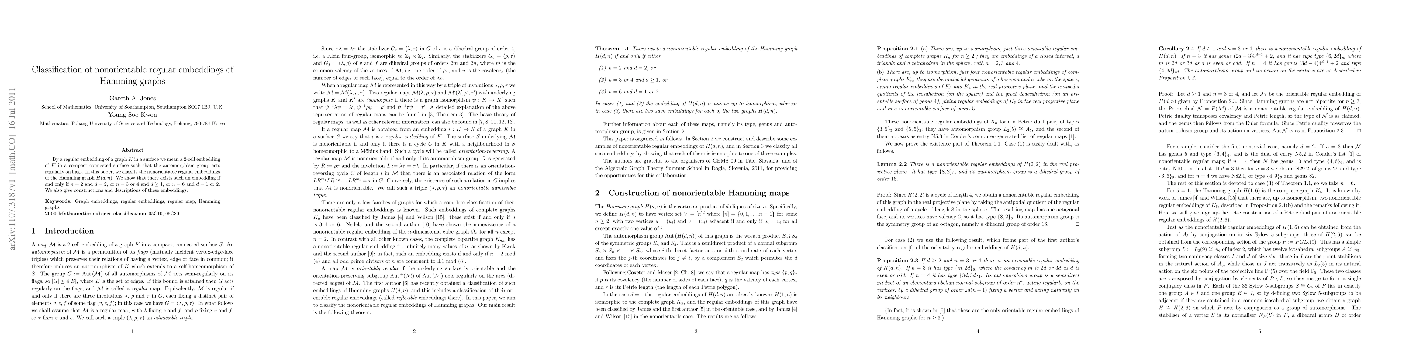 The paper classifies nonorientable regular embeddings of Hamming graphs using group theory, automorphism groups, and Petrie duality.