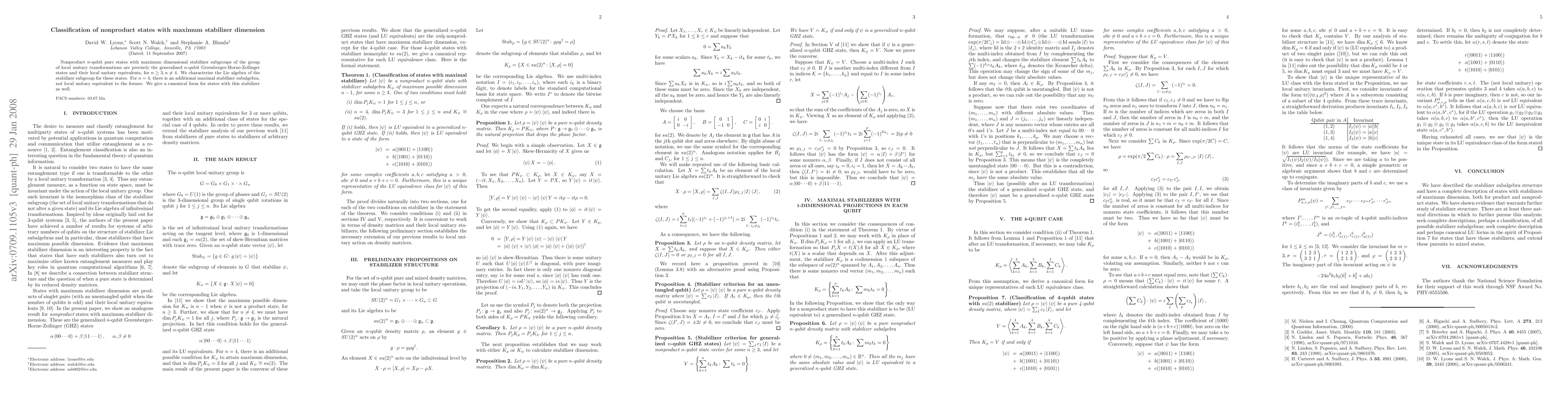 This research paper classifies non-product n-qubit states with maximum stabilizer dimension, finding that these states are either generalized GHZ states or have an additional maximal subalgebra for n=4.
