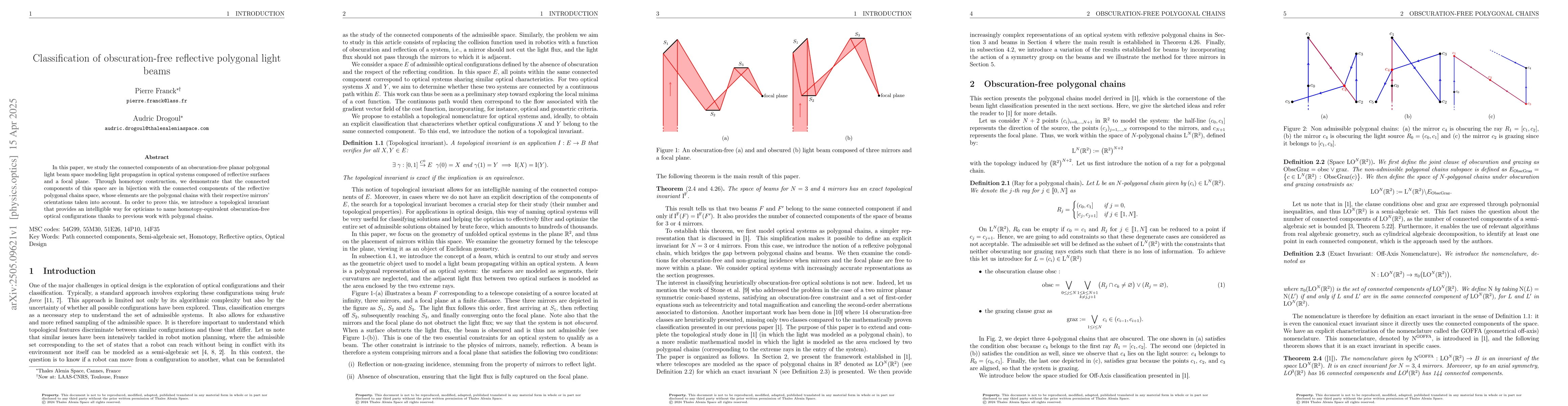 The paper introduces novel topological invariants and a homotopy-based classification framework for obscuration-free reflective polygonal light beams, significantly advancing the understanding of optical system design.