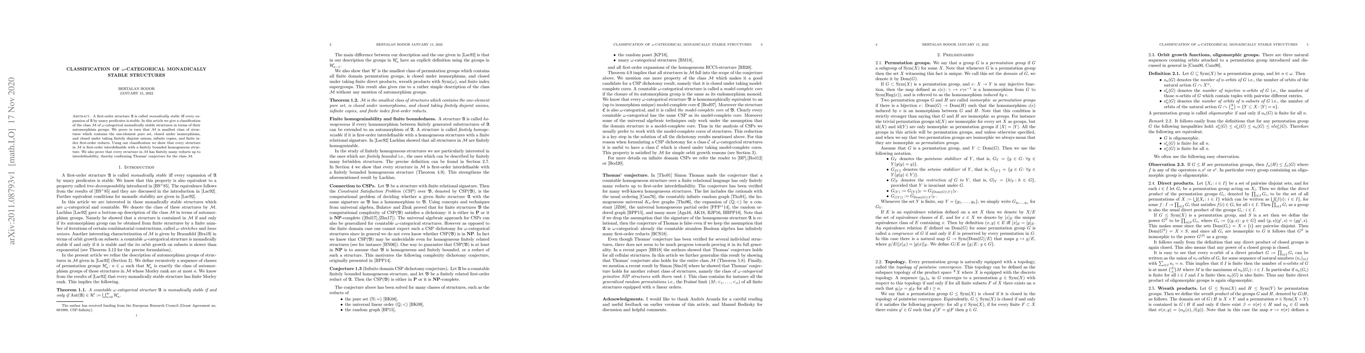 A first-order structure $\mathfrak{A}$ is called monadically stable iff every expansion of $\mathfrak{A}$ by unary predicates is stable. In this article we give a classification of the class $\mathcal{M}$ of $\omega$-categorical monadically stable structures in terms of their automorphism groups. We prove in turn that $\mathcal{M}$ is smallest class of structures which contains the one-element pure set, closed under isomorphisms, and closed under taking finitely disjoint unions, infinite copies, and finite index first-order reducts. Using our classification we show that every structure in $\mathcal{M}$ is first-order interdefinable with a finitely bounded homogeneous structure. We also prove that every structure in $\mathcal{M}$ has finitely many reducts up to interdefinability, thereby confirming Thomas' conjecture for the class $\mathcal{M}$.