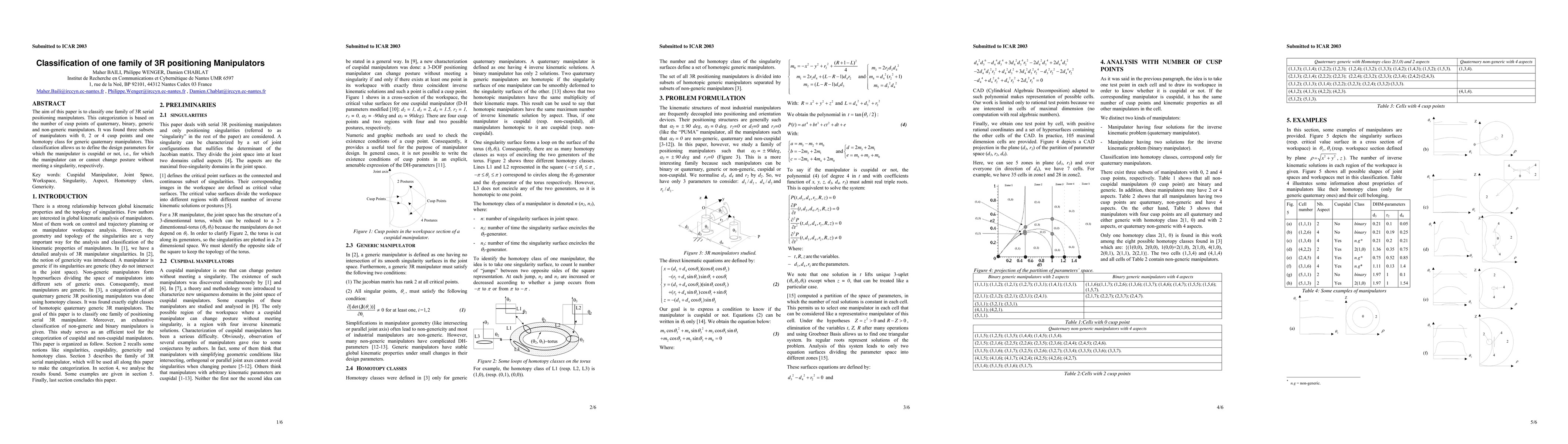 The aim of this paper is to classify one family of 3R serial positioning manipulators. This categorization is based on the number of cusp points of quaternary, binary, generic and non-generic manipulators. It was found three subsets of manipulators with 0, 2 or 4 cusp points and one homotopy class for generic quaternary manipulators. This classification allows us to define the design parameters for which the manipulator is cuspidal or not, i.e., for which the manipulator can or cannot change posture without meeting a singularity, respectively.