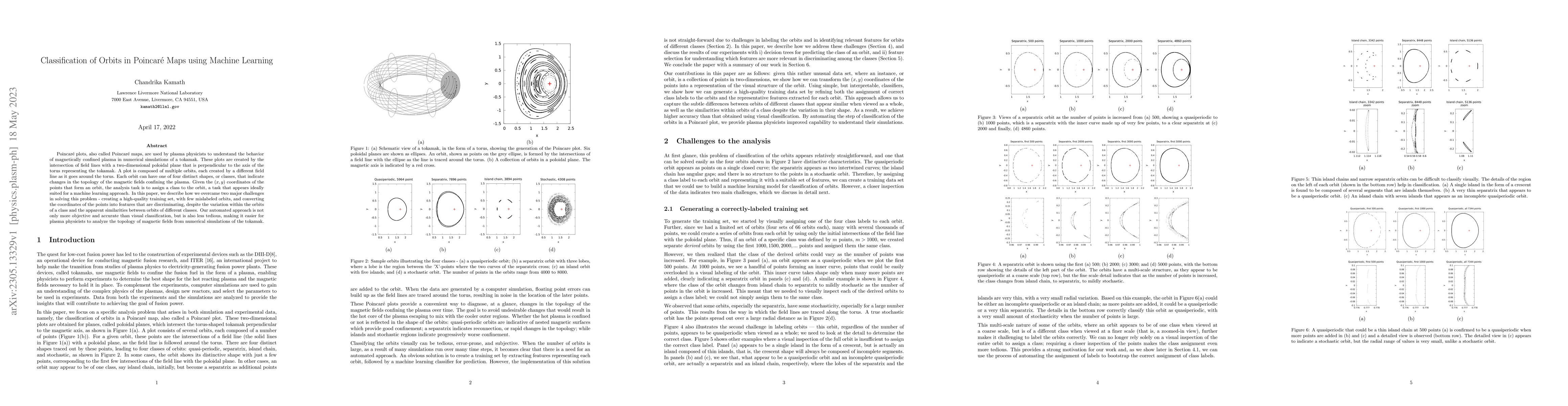Poincar\'e plots, also called Poincar\'e maps, are used by plasma physicists to understand the behavior of magnetically confined plasma in numerical simulations of a tokamak. These plots are created by the intersection of field lines with a two-dimensional poloidal plane that is perpendicular to the axis of the torus representing the tokamak. A plot is composed of multiple orbits, each created by a different field line as it goes around the torus. Each orbit can have one of four distinct shapes, or classes, that indicate changes in the topology of the magnetic fields confining the plasma. Given the (x,y) coordinates of the points that form an orbit, the analysis task is to assign a class to the orbit, a task that appears ideally suited for a machine learning approach. In this paper, we describe how we overcame two major challenges in solving this problem - creating a high-quality training set, with few mislabeled orbits, and converting the coordinates of the points into features that are discriminating, despite the variation within the orbits of a class and the apparent similarities between orbits of different classes. Our automated approach is not only more objective and accurate than visual classification, but is also less tedious, making it easier for plasma physicists to analyze the topology of magnetic fields from numerical simulations of the tokamak.